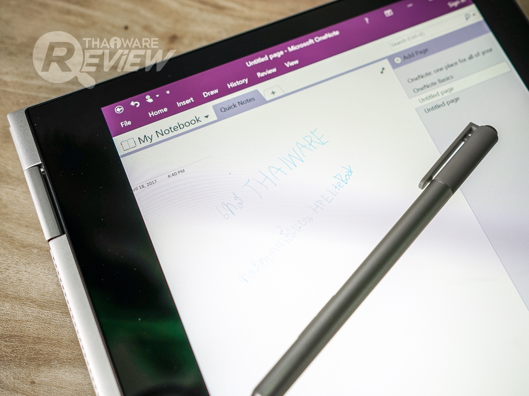 สำหรับคนชอบจด HP EliteBook x360 1030 G2 มีปากกาให้มาด้วยนะ สัมผัสในการเขียนดีพอสมควร สามารถวางมือบนหน้าจอตอนเขียนได้ หัวปากกาแยกน้ำหนักได้หลายระดับ จากการลองขีดเขียนเล่นๆ ผมว่าดีพอๆ กับปากกาของ Microsoft Surface เลย