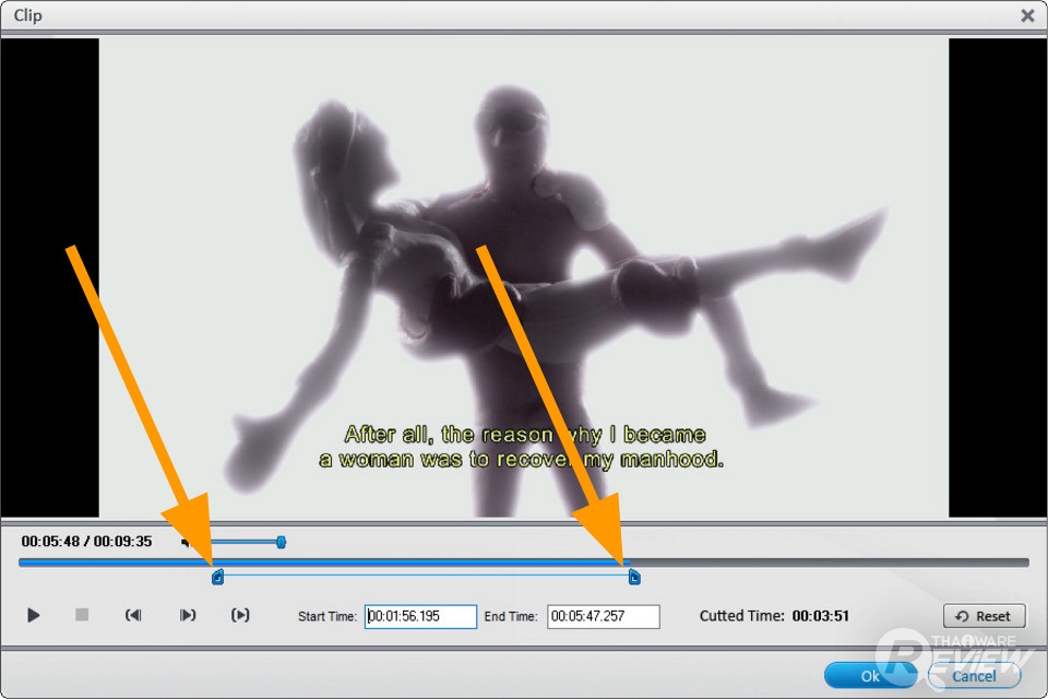 หน้าต่างการ Clip ใช้เพื่อหั่นส่วนหัวและส่วนท้ายของคลิปทิ้ง ที่สามารถเรียกใช้งานผ่านปุ่มกรรไกร จะมีสไลด์เดอร์ 2 ตัวให้เราเลื่อน เพื่อกำหนดจุดเริ่มต้น และจุดจบของคลิปเสียใหม่ เพื่อให้คลิปสั้นลง มีแต่เฉพาะเนื้อหาที่เราต้องการดู โดยจะมีการแสดงความยาวของคลิปที่เหลือจากการตัด แสดงอยู่ในส่วน Cutted Time เมื่อ กำหนดการหั่นวิดีโอ เรียบร้อยแล้ว คลิปที่ปุ่ม OK ได้เลยครับ
