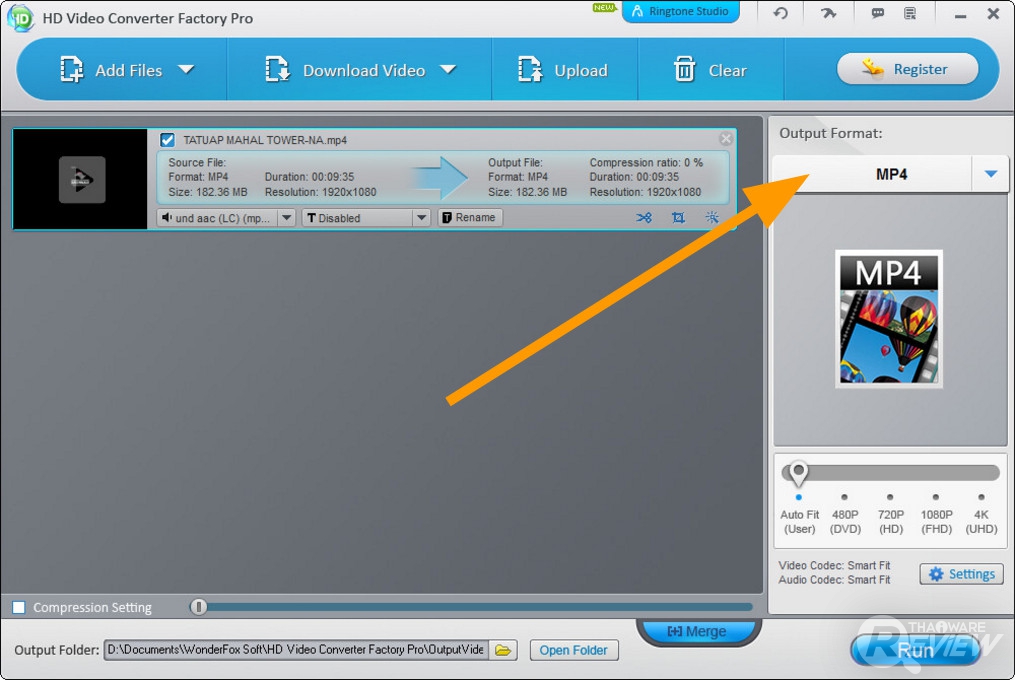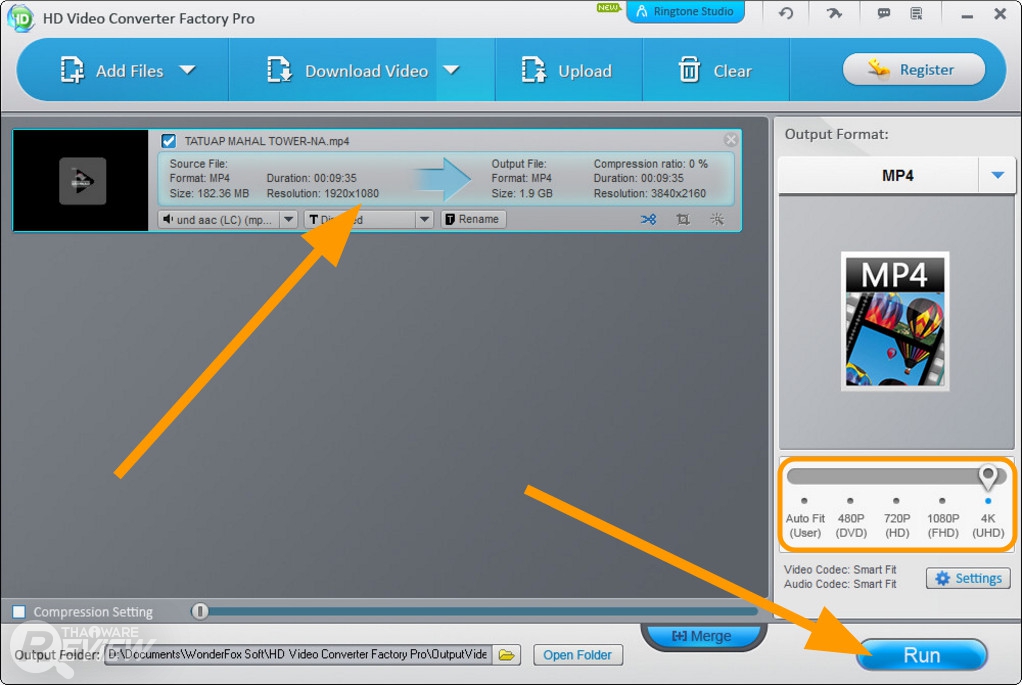 เมื่อเลือกฟอร์แมตวิดีโอที่ต้องการแปลงได้แล้ว (เราเลือกเป็นแบบ MP4) ลำดับต่อมา เราจะเลือกความละเอียดของไฟล์วิดีโอที่ต้องการ โดยการเลื่อนสไลด์เดอร์ที่อยู่แถวมุมล่างขวาของหน้าต่างโปรแกรม และในตัวอย่างนี้ เราจะทำการแปลงจากวิดีโอต้นฉบับที่มีความละเอียดระดับ Full HD 1,920x1,080 จุด ให้เป็นไฟล์วิดีโอระดับ 4K (UHD) เมื่อเลือกระดับความละเอียดเรียบร้อยแล้ว คลิกที่ปุ่ม RUN จากนั้นการแปลงไฟล์ก็จะเริ่มขึ้นครับ