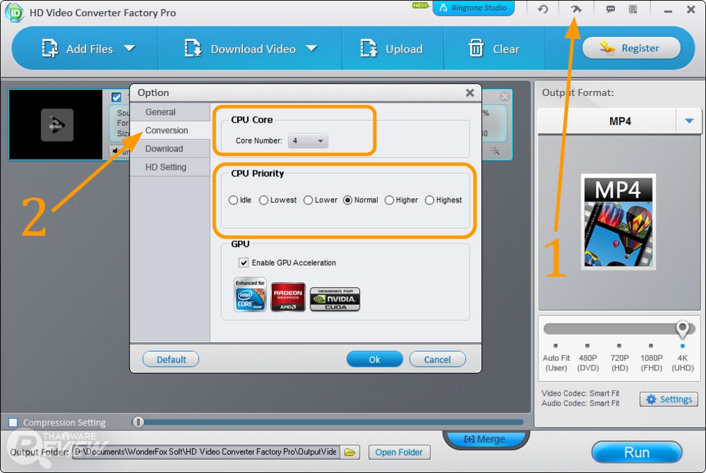 แต่อย่างไรก็ดี สำหรับคนที่ซื้อเวอร์ชันเต็มของโปรแกรมไปใช้ เราก็ขอแนะนำว่า สามารถปรับเร่งความเร็วการแปลงไฟล์วิดีโอได้ตามภาพด้านบนเลยครับ โดยอันดับแรก คลิกที่ ปุ่มรูปค้อน ทางด้านบน หน้าต่าง Option ก็จะเปิดออก ให้เราคลิกเลือกที่แถบเมนู Conversion ก็จะเจอการปรับแต่งค่าในส่วนของ Core CPU ที่เราสามารถเลือกจำนวนแกนการประมวลผลของ CPU ที่จะใช้ในการแปลงไฟล์วิดีโอได้ และในส่วนของ CPU Priority ใช้เลือกระดับความเข้มข้นในการใช้ CPU มาทำหน้าที่แปลงไฟล์วิดีโอ โดยปกติค่าจะตั้งอยู่ที่ระดับ Normal แต่ถ้าต้องการแปลงไฟล์ให้เสร็จเร็วขึ้น ให้เซ็ตไปที่ระดับ Highest ได้เลยครับ