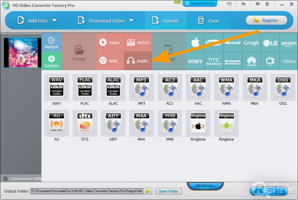 เมื่อคลิกก็จะมีการเปิดหน้าต่างที่ใช้สำหรับเลือกฟอร์แมตการแปลงไฟล์เสียง ซึ่งโปรแกรม WonderFox HD Video Converter Factory Pro รองรับฟอร์แมตการแปลงไฟล์เสียงที่หลากหลายมาก อาทิ
