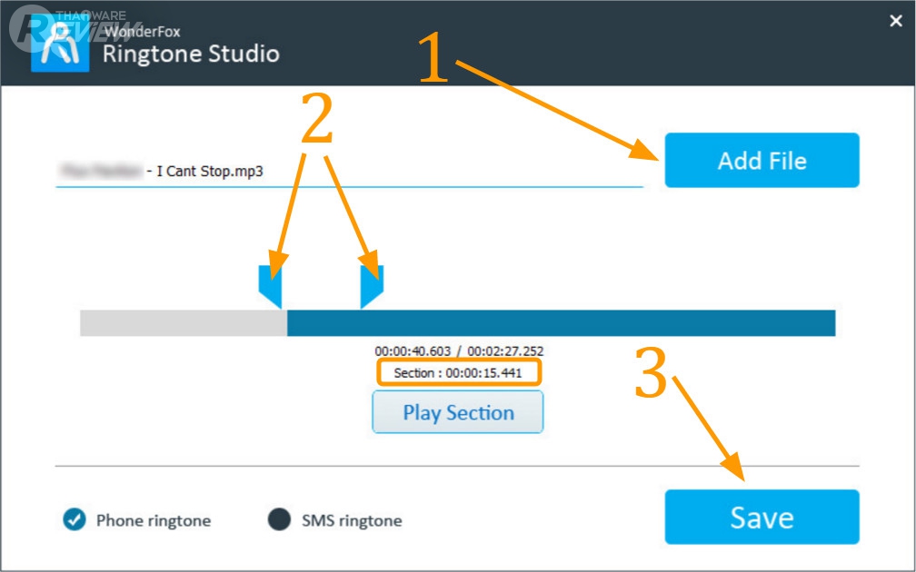 จากนั้น ก็จะเข้าสู่หน้าต่าง Ringtone Studio ที่ใช้เป็นศูนย์กลางในการตัดต่อเสียงริงโทน วิธีการก็ง่ายๆ ครับ ขั้นตอนที่ 1 คลิกปุ่ม Add File เพื่อเลือกเพลงที่ต้องการนำมาตัดใช้เป็นริงโทน ขั้นตอนที่ 2 จะเห็นว่ามีสไลด์เดอร์อันซ้าย และขวาที่เราสามารถเลื่อนเพื่อกำหนดจุดเริ่มต้น และจุดจบของเสียงริงโทนได้ตามต้องการ ซึ่งโดยส่วนใหญ่แล้ว เสียงริงโทนมักจะเลือกใช้ท่อนฮุกของเพลง และมักจะเป็นท่อนเสียงสั้นๆ ความยาวอาจไม่เกิน 30 วินาทีครับ โดยเราสามารถตรวจสอบความยาวของเสียงริงโทนได้ในส่วนของ Section เลย และในระหว่างตัดริงโทน เราสามารถคลิกปุ่ม Play Section เพื่อฟังท่อนเสียงที่เราเลือก ว่ามีความเหมาะสมหรือไม่ เมื่อทุกอย่างลงตัวแล้ว ก็ให้คลิกที่ปุ่ม Save โปรแกรมก็จะจัดการบันทึกไฟล์เสียงริงโทน แล้วเราก็สามารถนำไปใช้งานได้เลยครับ