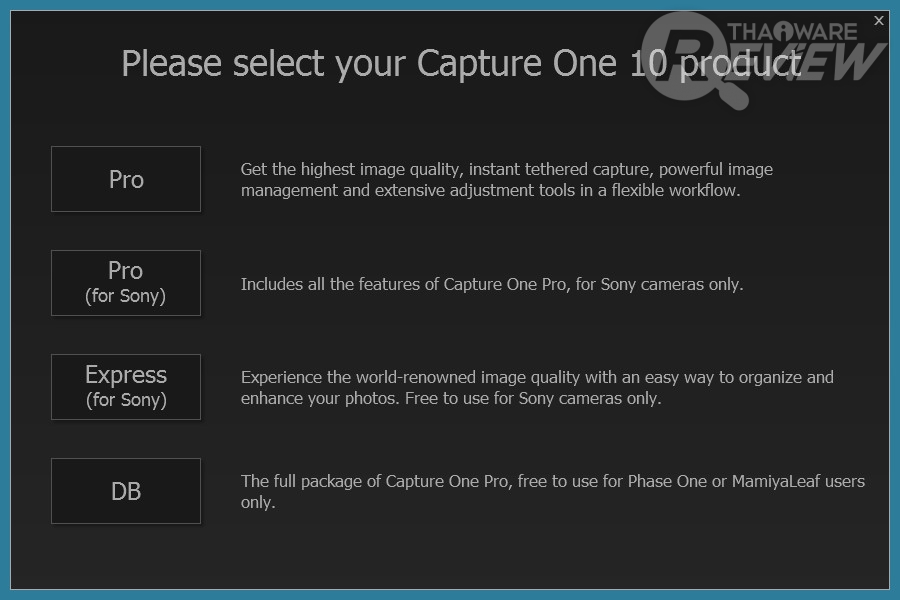 หลังจากติดตั้งโปรแกรม Capture One เรียบร้อยแล้ว เมื่อเปิดโปรแกรมครั้งแรก จะมีเวอร์ชันของโปรแกรมให้เลือก 4 โหมดด้วยกัน โดยสำหรับเวอร์ชัน Pro และ Pro (for Sony) จะเป็น Shareware ที่ให้ทดลองใช้งานเป็นเวลา 30 วัน ส่วน Express (for Sony) และ DB จะเป็นเวอร์ชันฟรี ตามเงื่อนไขของทางผู้พัฒนา โดยสำหรับรีวิวนี้ เราจะขอใช้งานเวอร์ชัน Pro ให้ชมกันครับ