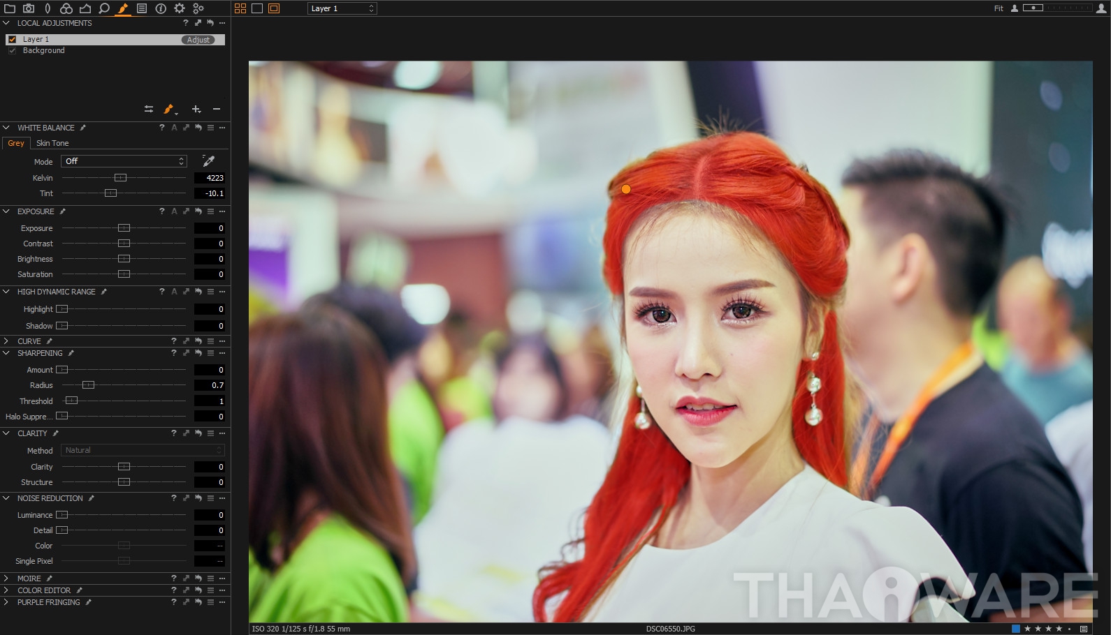 สำหรับการ Mask ในโปรแกรมนี้ จะใช้ชื่อว่า Local Adjustment (ปรับแต่งเฉพาะจุด) โดยเราสามารถ เลือกเมนูพู่กัน (Brush) - หรือกดปุ่มคีย์ลัด B แล้วระบายในจุดที่ต้องการ Mask ได้เลย เมื่อระบายเสร็จเรียบร้อย ก็จะได้ Layer แยกออกมาที่หน้าต่างซ้ายบน ให้เลือกปรับแต่งเฉพาะจุดได้