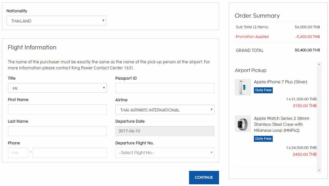 เนื่องจากเป็นสินค้า Duty Free เราจะต้องกรอกข้อมูลหมายเลขพาสปอร์ต, สายการบิน, หมายเลขไฟลท์ และวันเดินทาง ให้เรียบร้อย แล้วคลิก Proceed to Checkout อีกครั้งเพื่อชำระเงิน ซึ่งในตอนนี้ KingPower ยังไม่รับชำระด้วยเงินสดนะครับ จะเป็นการตัดผ่านบัตรเท่านั้น รองรับ วีซ่า, มาสเตอร์, ยูเนียนเพย์, อลิเพย์ ทั้งเครดิต และเดบิตการ์ด