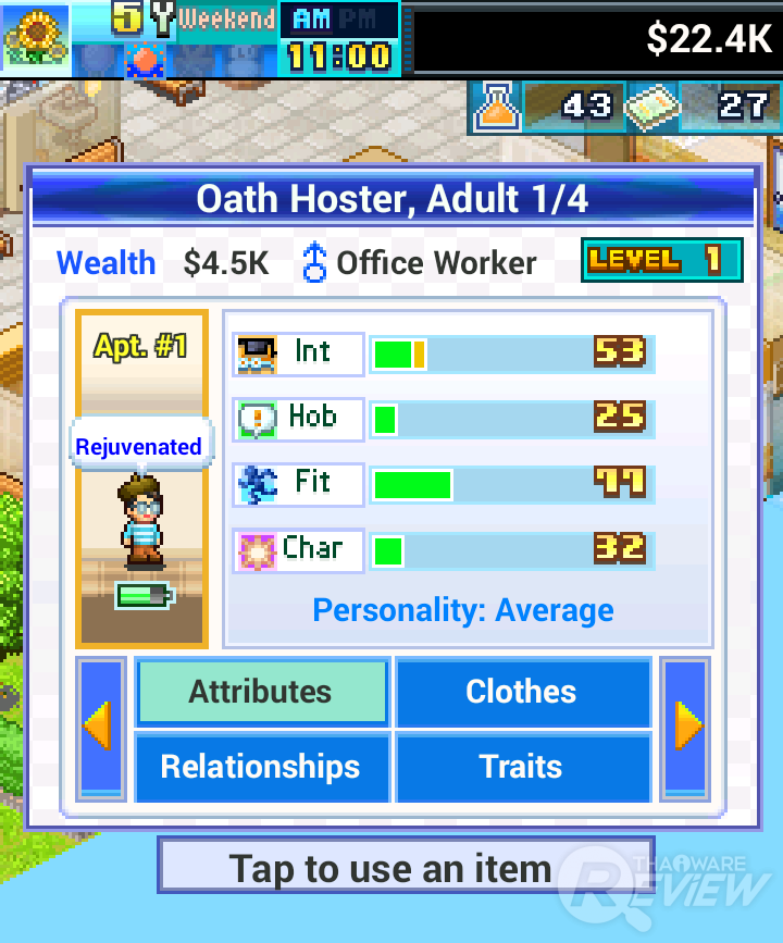 แก่นหลักของเกมส์จริงๆ คือการประสบความสำเร็จด้านรายได้จากการเป็นเจ้าของอพาร์ทเม้นท์เหมือนดั่งเกมส์แนวจำลองทั้งหลายนั่นแหละครับ เพียงแต่ตัวเกมส์จะไม่ได้ขับเน้นไปที่การดูแลลูกค้าแบบเชิงลึกหรือจัดโครงสร้างธุรกิจภายในเหมือนเกมส์แนว Tycoon ทั้งหลาย (Civilization, Tropico ฯลฯ) หากแต่จะเป็นการรวบย่อให้กลายเป็นค่าสถานะความพร้อมในการใช้ชีวิตและความพร้อมในอาชีพรูปแบบต่างๆ แทน และไอการต้องมาคอยเพิ่มค่านี้สถานะเหล่านี้นี่แหละที่ทำให้ตัวเกมส์เล่นได้แบบติดหนึบ