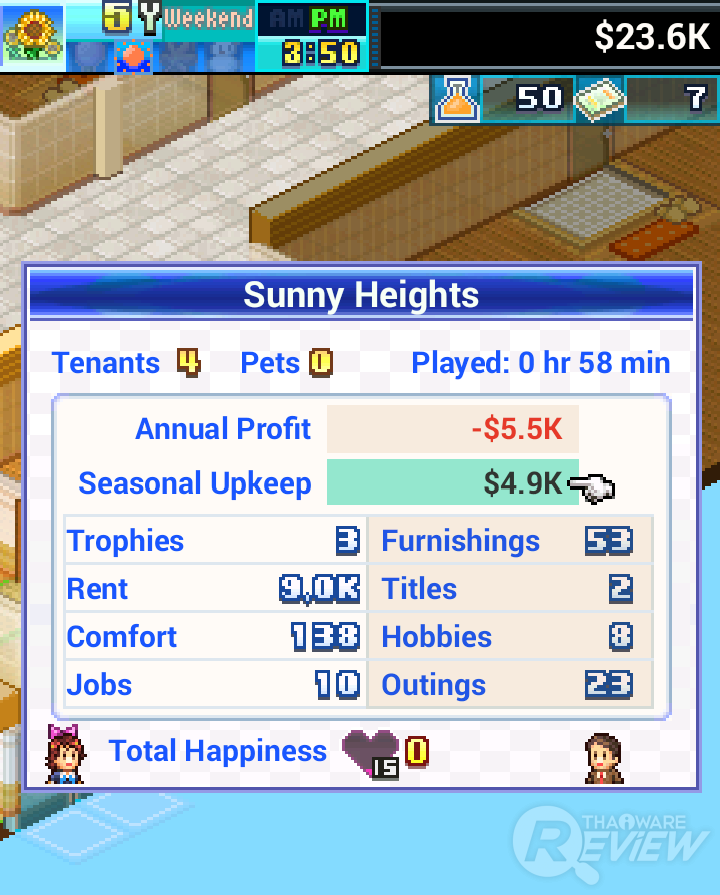 อีกทั้งสิ่งของเหล่านี้ยังมาพร้อมค่าทะนุบำรุงที่ผู้เล่นจำต้องจ่ายต่อฤดูกาลอีกด้วย ซึ่งหากค่าพักที่ผู้พักอาศัยจ่ายให้เราต่อเดือนน้อยกว่าค่าทะนุบำรุงแล้วละก็ บอกได้เลยครับว่าอพาร์ทเม้นท์ที่เราดูแลอยู่นี้ "มีแววเจ๊งมาแต่ไกลเลยละ"