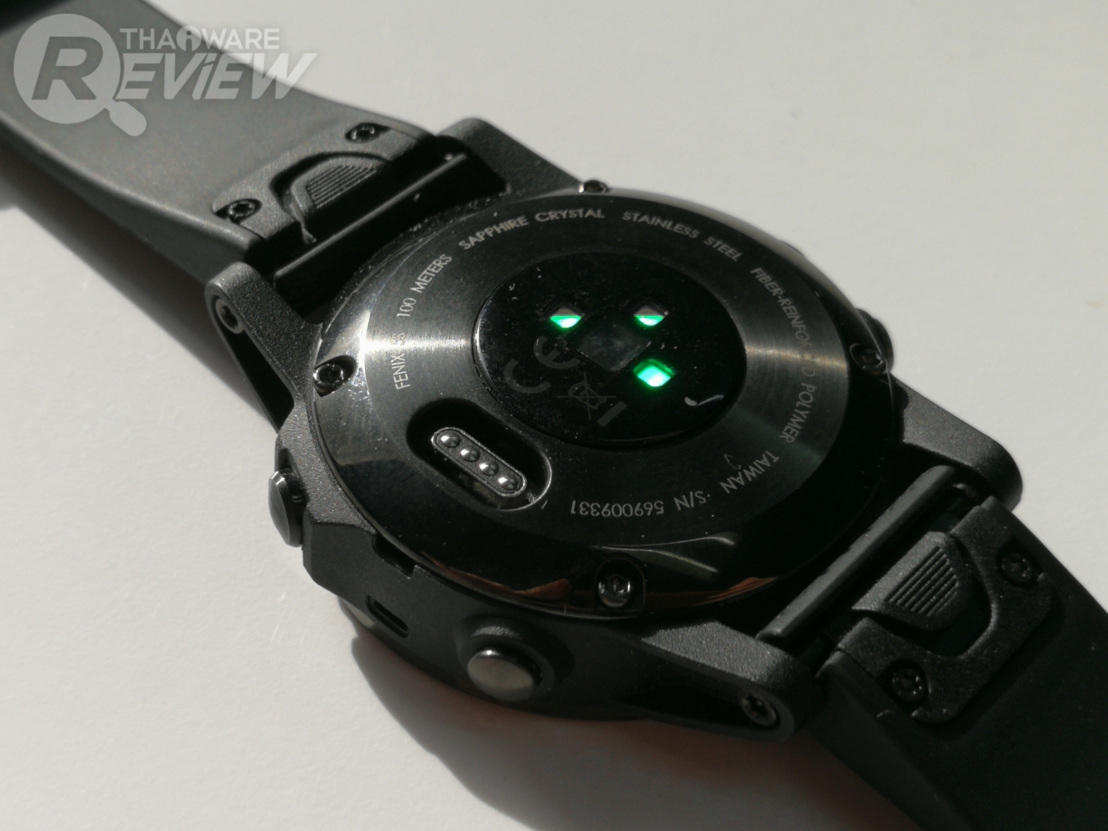 ด้านใต้ของหน้าปัด Fenix 5S จะเป็นช่องสำหรับชาร์จแบตเตอรี่ และเซ็นเซอร์วัดอัตราการเต้นของหัวใจ ที่รุ่นนี้ไม่นูนเหมือนรุ่นก่อนหน้าแล้ว ทำให้สามารถใส่สปอร์ตวอชได้แนบชิดกับข้อมือได้มากขึ้น