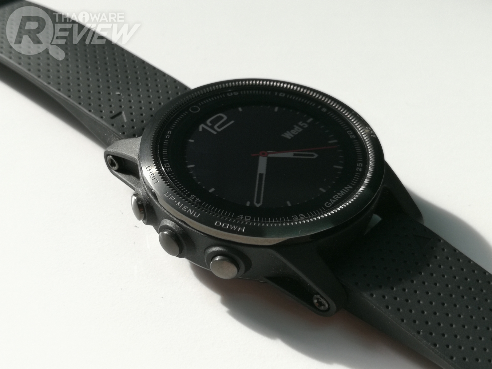 สำหรับปุ่มการควบคุมของ Fenix 5S จะมีอยู่ด้วยกัน 5 ปุ่มด้วยกัน ซึงการจัดเรียงก็ค่อนข้างง่ายต่อการจดจำนะ โดยด้านซ้าย 3 ปุ่มจะประกอบไปด้วย ปุ่มเปิดไฟ (Light) /เลื่อนขึ้น (Up, Menu) /เลื่อนลง (Down) ตามลำดับ ส่วนด้านขวา 2 ปุ่มเป็น ปุ่มตกลง/ยกเลิก (Back, Lap) ตามลำดับ (และสามารถกดค้างเพื่อใช้คำสั่งอื่นได้ เช่น ปุ่มเปิดไฟ เมื่อกดค้างจะเป็นการเปิด/ปิดนาฬิกา หรือปุ่มเลื่อนขึ้น เมื่อกดค้างจะเป็นการเข้ารายการเมนูต่างๆ) ซึ่งตรงนี้ บางคนอาจจะรู้สึกว่านาฬิกาข้อมือราคาประมาณนี้ อย่างน้อยน่าจะเป็นหน้าจอสัมผัสซักหน่อย แต่ส่วนตัวแล้ว เราว่าจุดประสงค์การใช้งานของสปอร์ตวอชตัวนี้ ที่ใช้ออกกำลังกายและลูกเล่นการใช้งานไม่ได้วาไรตี้เท่ากับสมาร์ทวอชอื่นๆ ทัชสกรีนจึงไม่ค่อยจำเป็นซักเท่าไหร่นัก (แต่เรื่องราคา มันก็สูงจริงๆ แหละ)