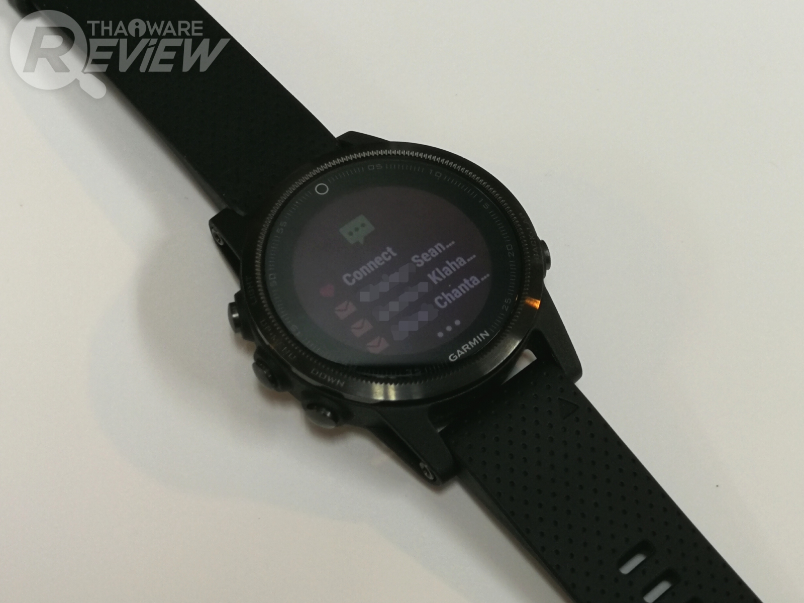 นอกจากการเก็บข้อมูลลงแอปฯ แล้ว เมื่อเชื่อมต่อ Fenix 5S กับสมาร์ทโฟน การแจ้งเตือนต่างๆ ไม่ว่าจะเป็นแอปฯ แชท โซเชียลต่างๆ หรืออีเมล ยังถูกนำมาโชว์แจ้งเตือนบน Fenix 5S ให้เราสามารถดูรายละเอียดคร่าวๆ ได้ และการแสดงผลจะรองรับภาษาไทยอีกด้วย แต่สำหรับอักขระพิเศษ ยังไม่รองรับนะครับ (เช่น เพื่อนที่ชื่อไลน์แปลกๆ Fenix จะแสดงผลเป็น ??????)