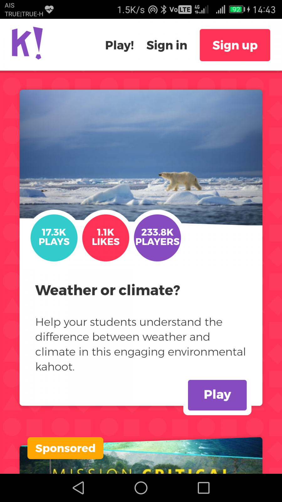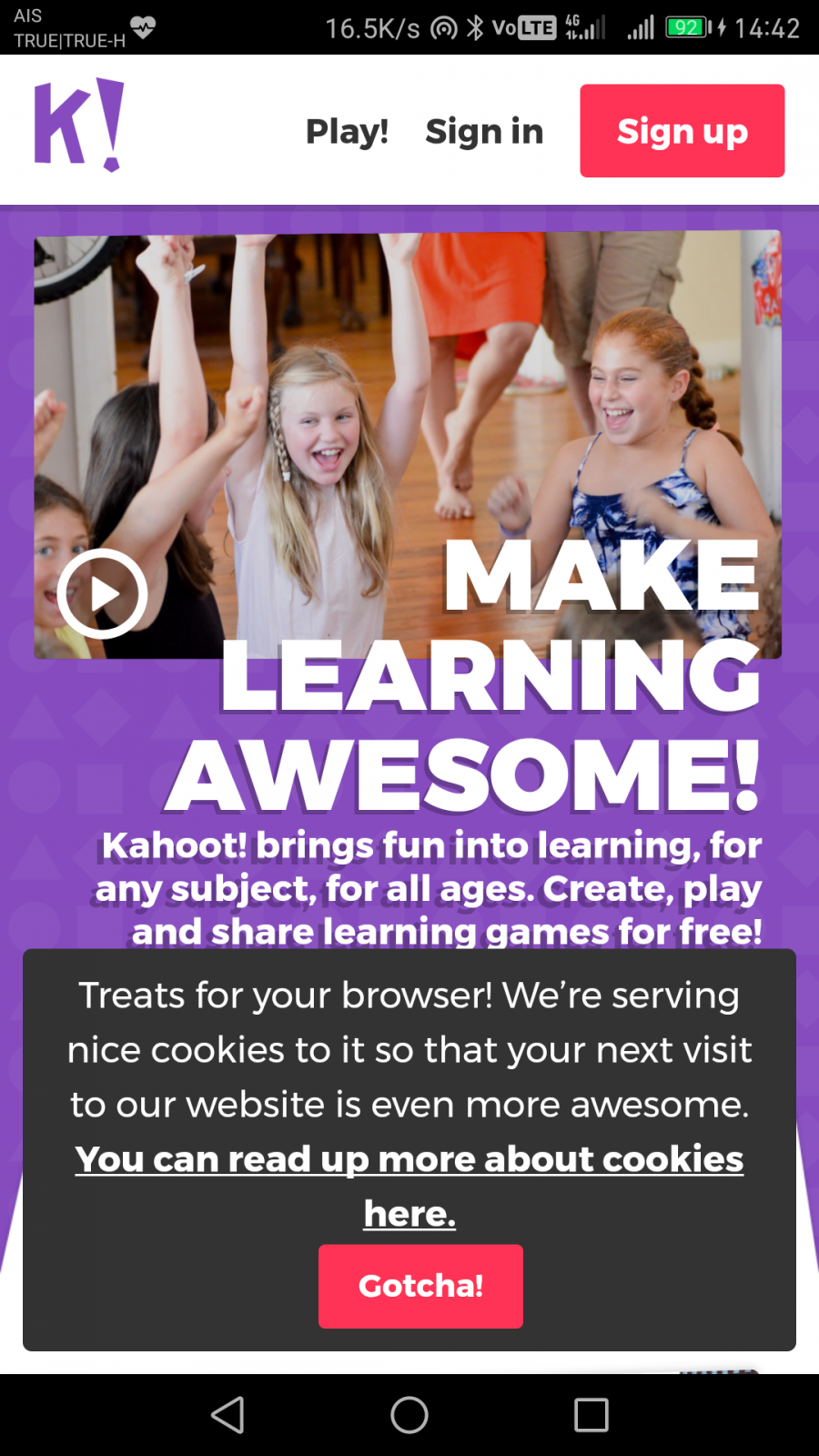 เข้าเว็บไซต์ kahoot.com เพื่อเลือกสร้างเกมส์ จัดการลงทะเบียน (Sign Up) ให้เรียบร้อย ในหน้าเว็บไซต์ จะมีเกมส์หรือกิจกรรมแนะนำ สนใจเกมส์ไหน ให้เราเลือกกด Play ได้เลย