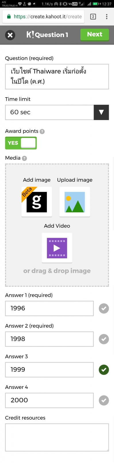 เราเลือกสร้าง Quiz ใส่คำถาม ภาพประกอบ ตัวเลือกคำตอบ