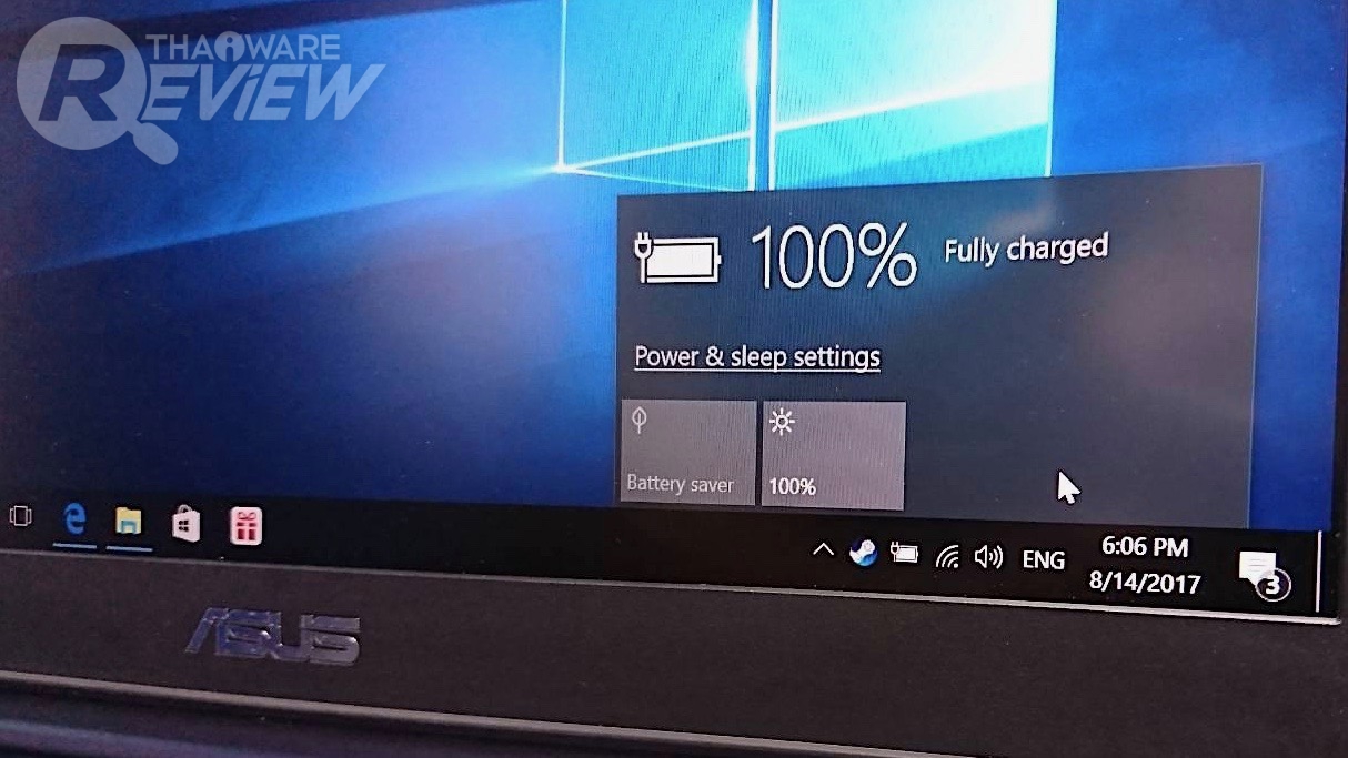 ในส่วนของแบตเตอรี่ทาง ASUS บอกไว้ว่าใช้งานได้ราวๆ 9 ชั่วโมงต่อการชาร์จแบตเต็ม 1 ครั้ง จากที่ได้ลองชาร์จเต็ม 100% แล้วลองเชื่อมต่อ Wi-Fi ใช้งานท่องเว็บ ฟังเพลง ดูวิดีโอ ทำงานพิมพ์เอกสารบ้าง ตัวเครื่องจัดการแบตเตอรี่ได้ดีเลยทีเดียวครับ ใช้ได้ราวๆ 7-8 ชั่วโมงกว่าๆ แบบเต็มที่ เท่านี้ก็เพียงพอต่อการใช้งานนอกบ้าน ไม่ต้องแบกที่ชาร์จไปใช้งานได้