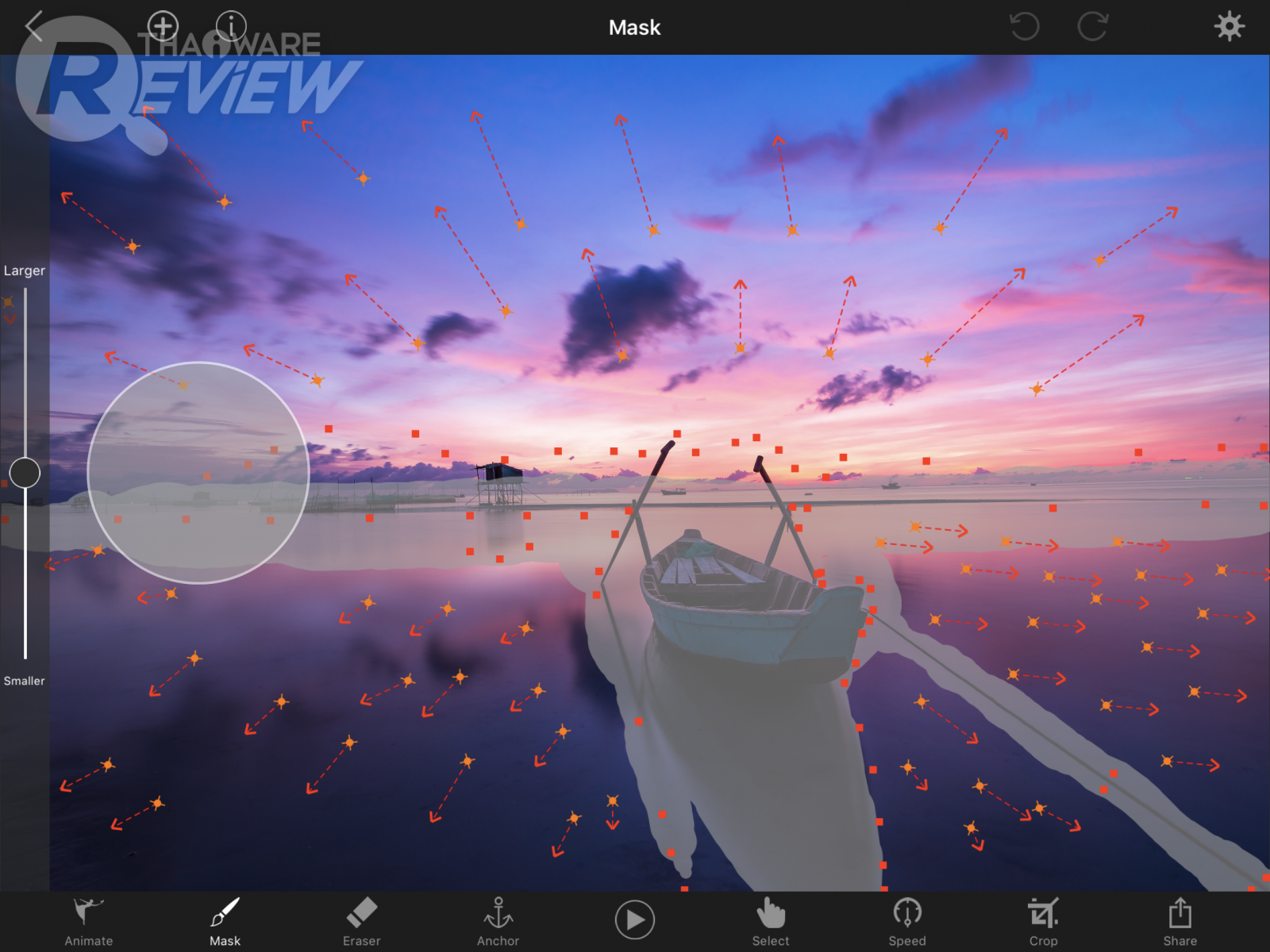 การทำก็ไม่มีอะไรยาก ให้เราระบาย mask ลงไปในจุดที่เราไม่ต้องการให้ภาพขยับ ซึ่งในภาพผมระบายตรงเรือเอาไว้ ในส่วนของท้องฟ้าผมลองใช้ Anchor ในกา่รกำหนดขอบเขตแทน ซึ่งอันที่จริงแล้ว เราจะใช้อันไหนก็ได้ตามแต่ความถนัดเลย (ในภาพผมจงใช้ทั้งสองเครื่องมือเพื่อให้เห็นภาพได้ง่ายๆ)