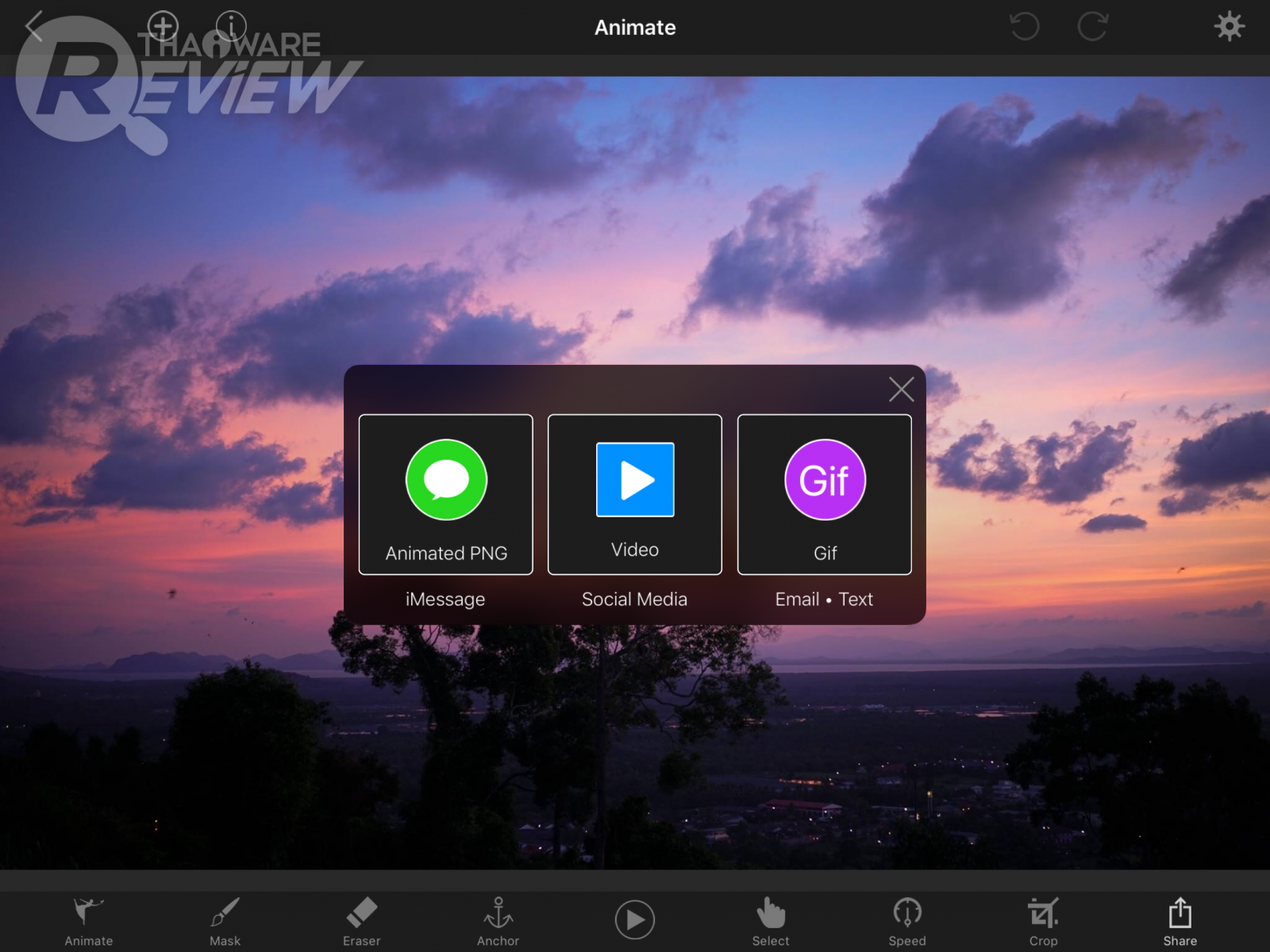 หลังจากงานเรียบร้อยเป็นที่น่าพอใจแล้ว ก็กด Share เพื่อบันทึกงาน โดยเราสามารถบันทึกเป็นไฟล์ภาพเคลื่อนไหว Animated PNG, GIFs หรือวิดีโอก็ได้ ตามใจชอบเลย