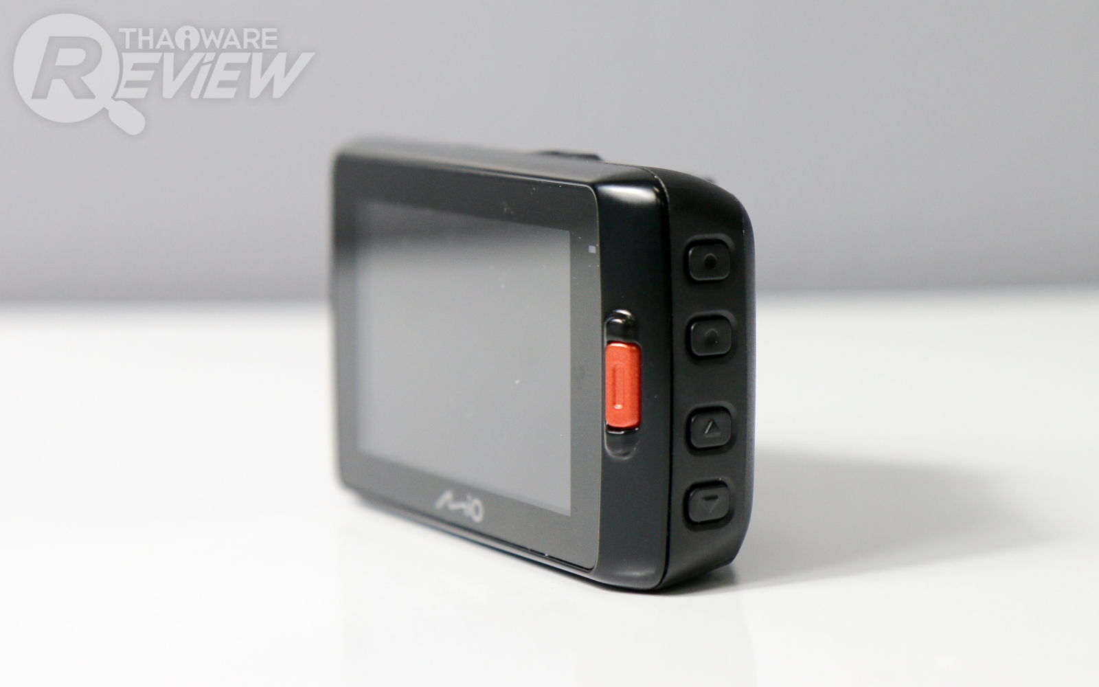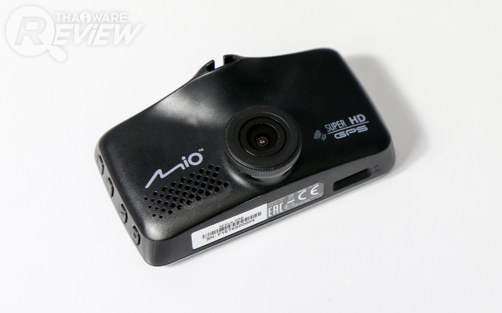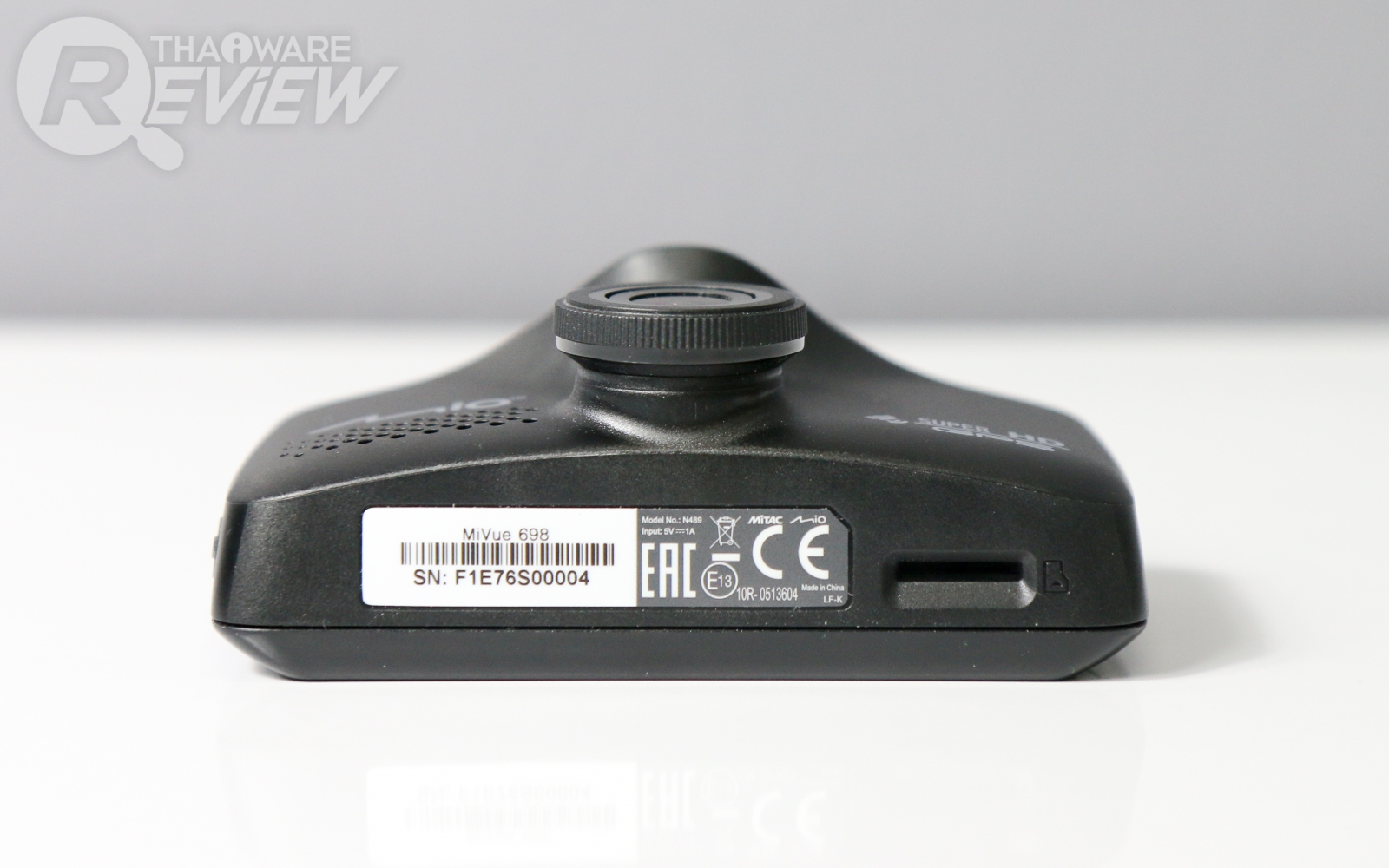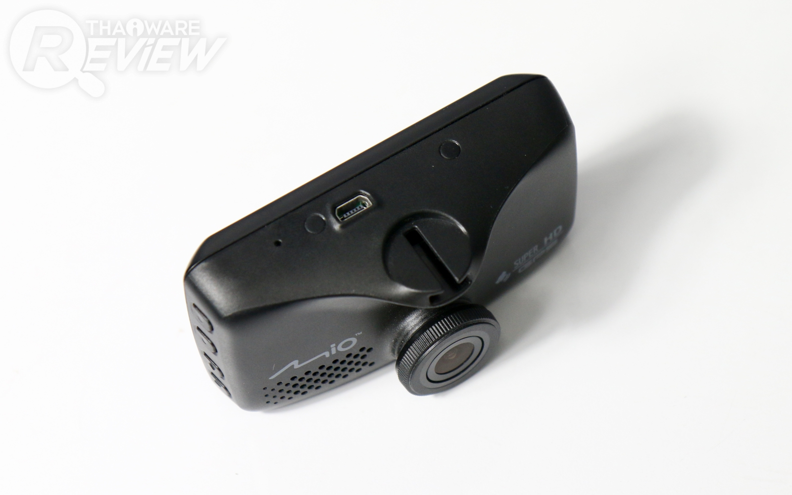 ด้านบนของกล้อง จะมีช่องสำหรับเสียบเข้ากับที่แปะกระจกรถ และช่องเสียบสายชาร์จไฟแบบ Mini USB น่าแปลกใจที่ไม่ใช้เป็น Micro USB