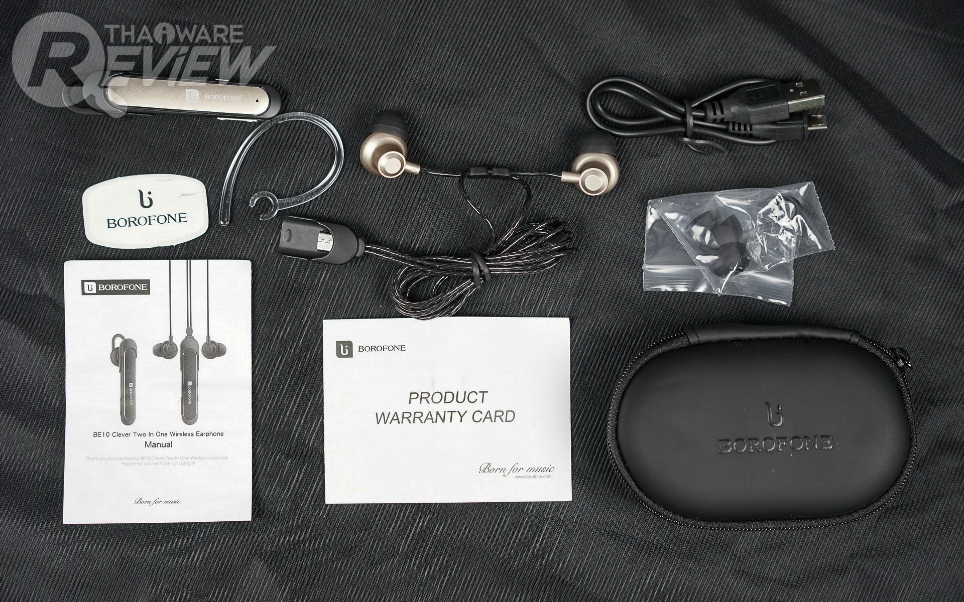 นี่คืออุปกรณ์ทุกอย่างที่ให้มา ก็จะประกอบไปด้วย หูฟัง BE10, ตัวเชื่อมต่อแบบหูฟังข้างเดียว, ตัวเชื่อมต่อแบบหูฟังสองข้าง, จุดหูฟังสำรอง, สายชาร์จแบบ Micro USB, กระเป๋าใส่หูฟัง, คู่มือการใช้งานเบื้องต้น และใบรับประกัน สังเกตว่าในกล่องไม่ได้ให้อะแดปเตอร์สำหรับชาร์จแบตเตอรี่มาให้นะครับ ซึ่งก็ใช้ของสมาร์ทโฟนที่เรามี หรือจะชาร์จผ่านคอมพิวเตอร์ก็ได้