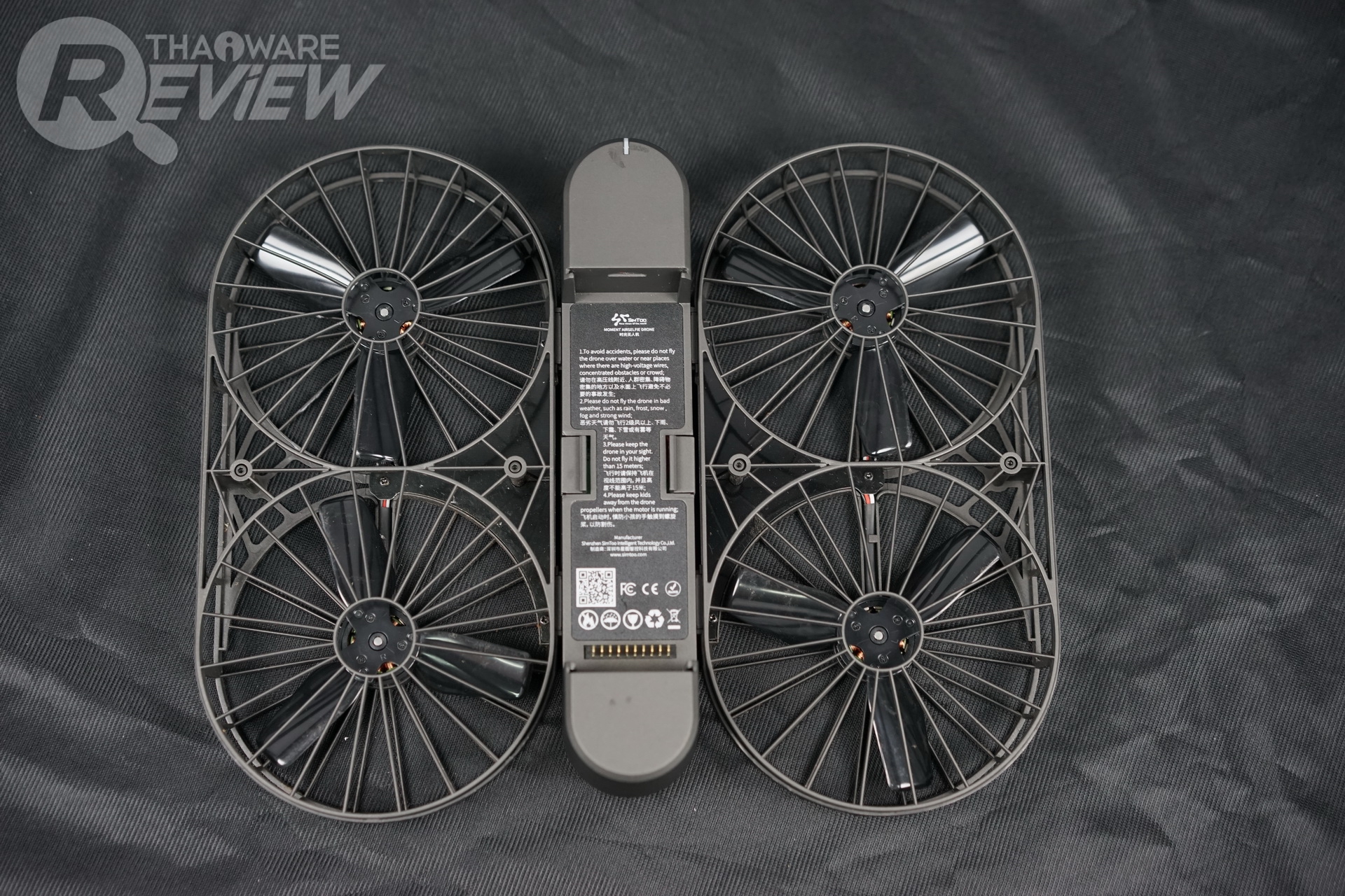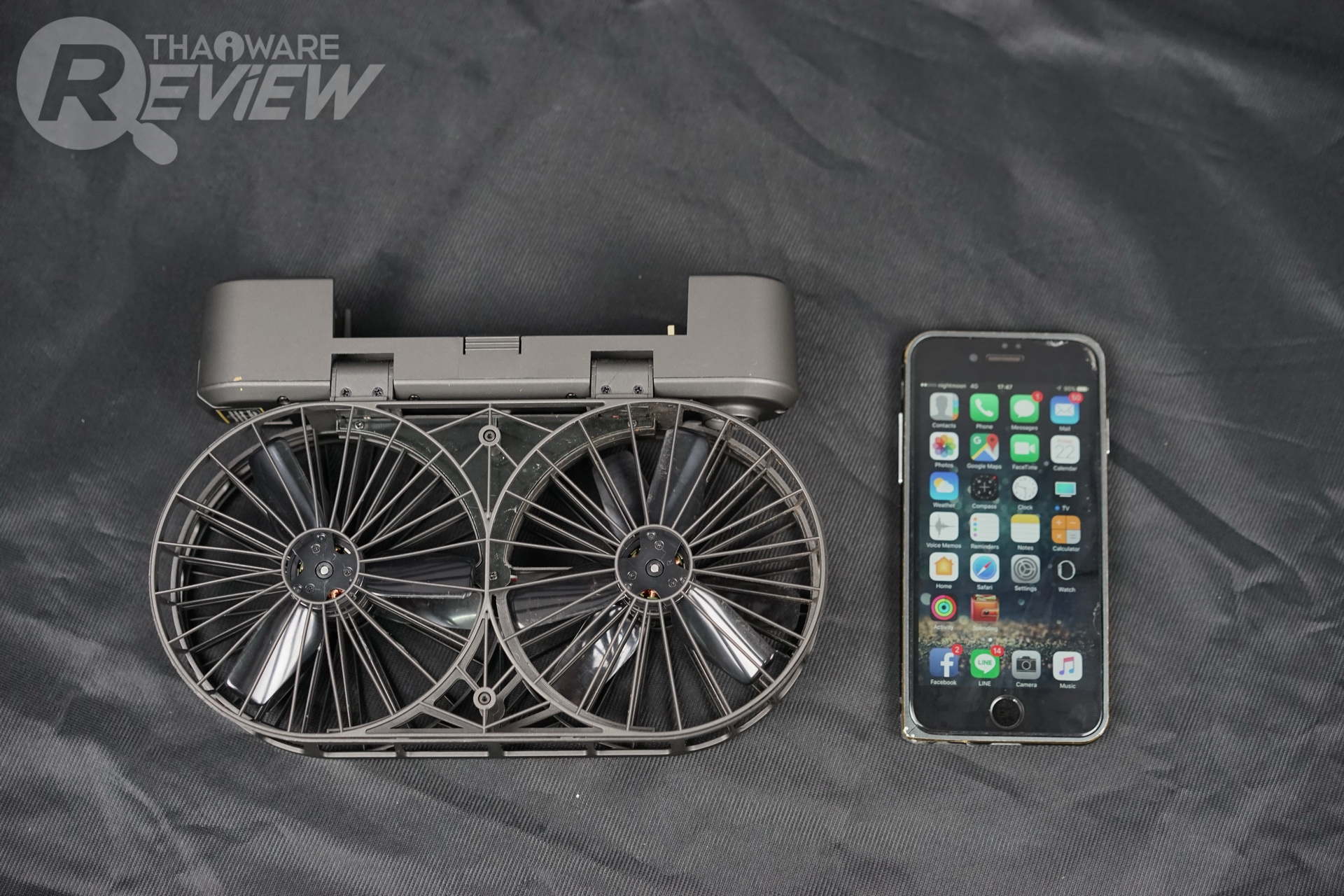 Simtoo Moment ตอนที่เราพับอยู่มีขนาดที่ค่อนข้างเล็กทีเดียว (ภาพเทียบกับขนาดของ iPhone 6) ตัวโดรนทำจากพลาสติกวัสดุค่อนข้างดี ดูไม่ก๊องแก๊ง ผิวพลาสติกดูเงาๆ สวยงามดี แต่ก็แลกมาด้วยข้อเสียอยู่อย่างหนึ่ง นั่นก็คือ ฝุ่นเกาะแล้วมองเห็นง่ายมาก