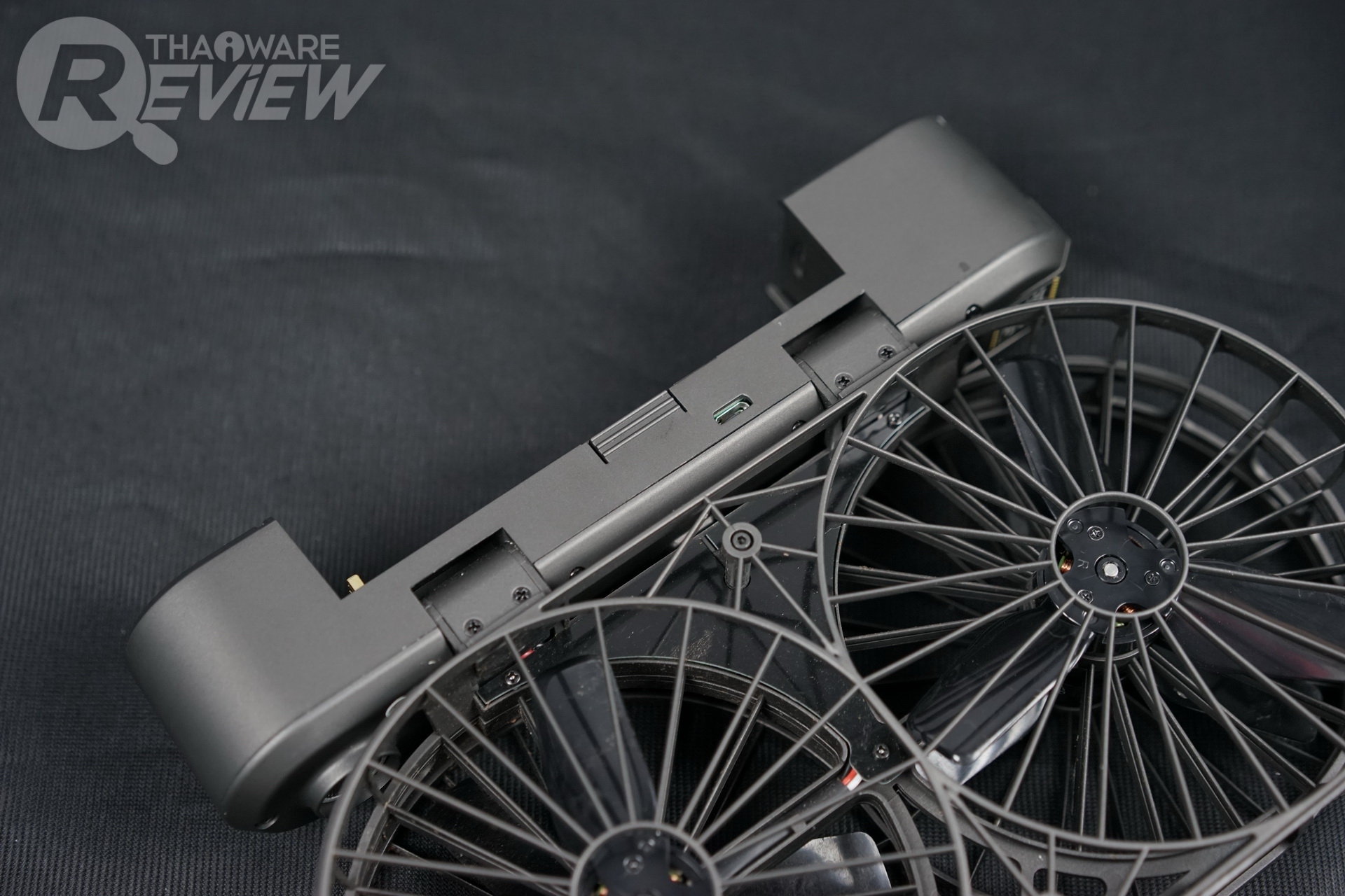 ด้านล่างของตัวโดรนมีเซ็นเซอร์อยู่ 2 จุด ตรงกลางเป็นกล้องตัวเล็ก คาดว่าไว้สำหรับวิเคราะห์ตำแหน่งในการเคลื่อนที่ และที่คล้ายๆ กับลำโพงที่ส่วนท้ายของโดรน คือ Ultrasonic sensor สำหรับคำนวนระยะห่างจากพื้นด้านล่าง