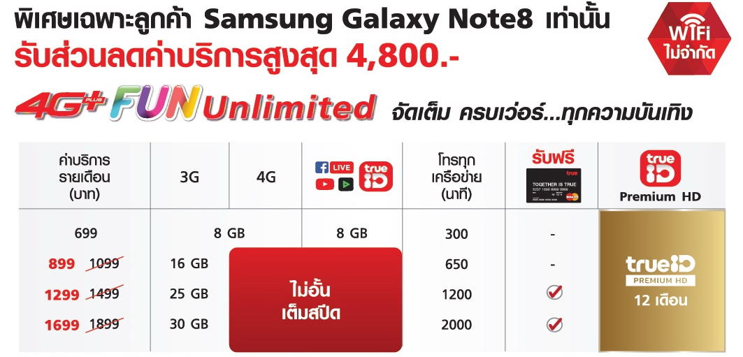 ด้วยส่วนลดค่าเครื่องที่มากถึง 5,000 บาท เมื่อเราซื้อ Samsung Galaxy Note 8 พร้อมกับสมัครแพ็คเกจ 4G+ FUN Unlimited 1,099 บาท ขึ้นไป ซึ่งโปรโมชั่นนี้สามารถใช้ได้ทั้งลูกค้าใหม่, ลูกค้าปัจจุบันทรูมูฟ เอช แบบรายเดือน รวมไปถึงลูกค้าที่ย้ายค่ายเบอร์เดิมสำเร็จตั้งแต่ 1 สิงหาคม 2560 เป็นต้นไป เท่ากับว่าจากปกติราคาเครื่องเปล่า 33,900 บาท เราสามารถซื้อ Samsung Galaxy Note 8 ได้ในราคาถูกสุดเพียง 28,900 บาท