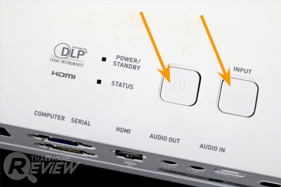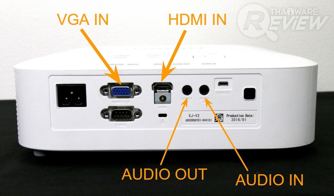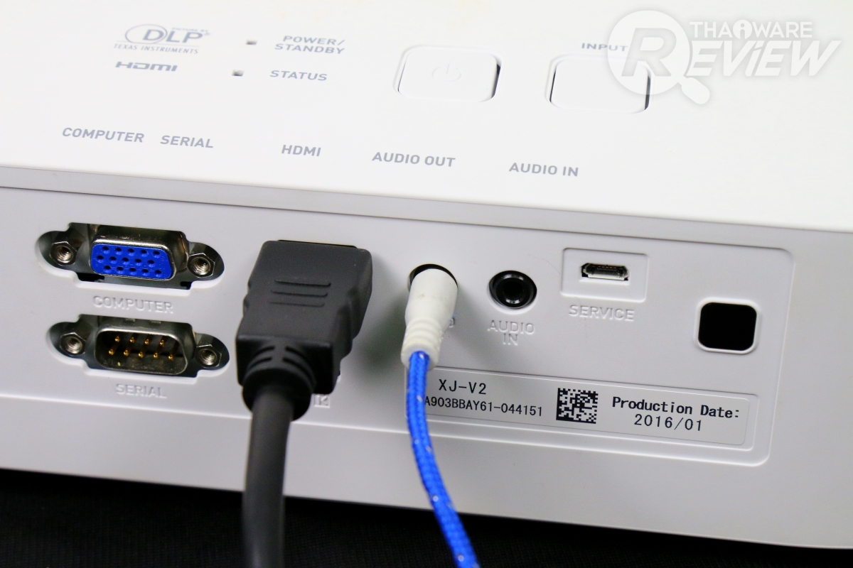 และด้วยความที่ในตัวเครื่องโปรเจคเตอร์ไม่มีลำโพง ทำให้ในกรณีที่เราเชื่อมต่อโปรเจคเตอร์เข้ากับเครื่องคอมฯ ผ่านสาย HDMI แล้วต้องการเปิดฉายงานนำเสนอ หรือคลิปวิดีโอที่มีเสียงประกอบ ก็ต้องนำชุดลำโพง หรือชุดเครื่องเสียงมาเสียบเข้ากับช่องแจ๊ค AUDIO OUT ของเครื่องโปรเจคเตอร์ เพื่อให้สามารถเล่นเสียงได้ครับ