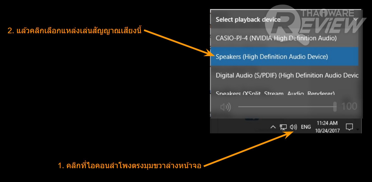 หรือจะใช้วิธีเลือกแหล่งการปล่อยสัญญาณเสียงจากเครื่องคอมฯ เป็นช่องแจ๊ค Speaker Out แล้วเสียบลำโพงผ่านเครื่องคอมฯ ตามปกติก็ได้ครับ วิธีการทำก็ตามภาพด้านบนเลย