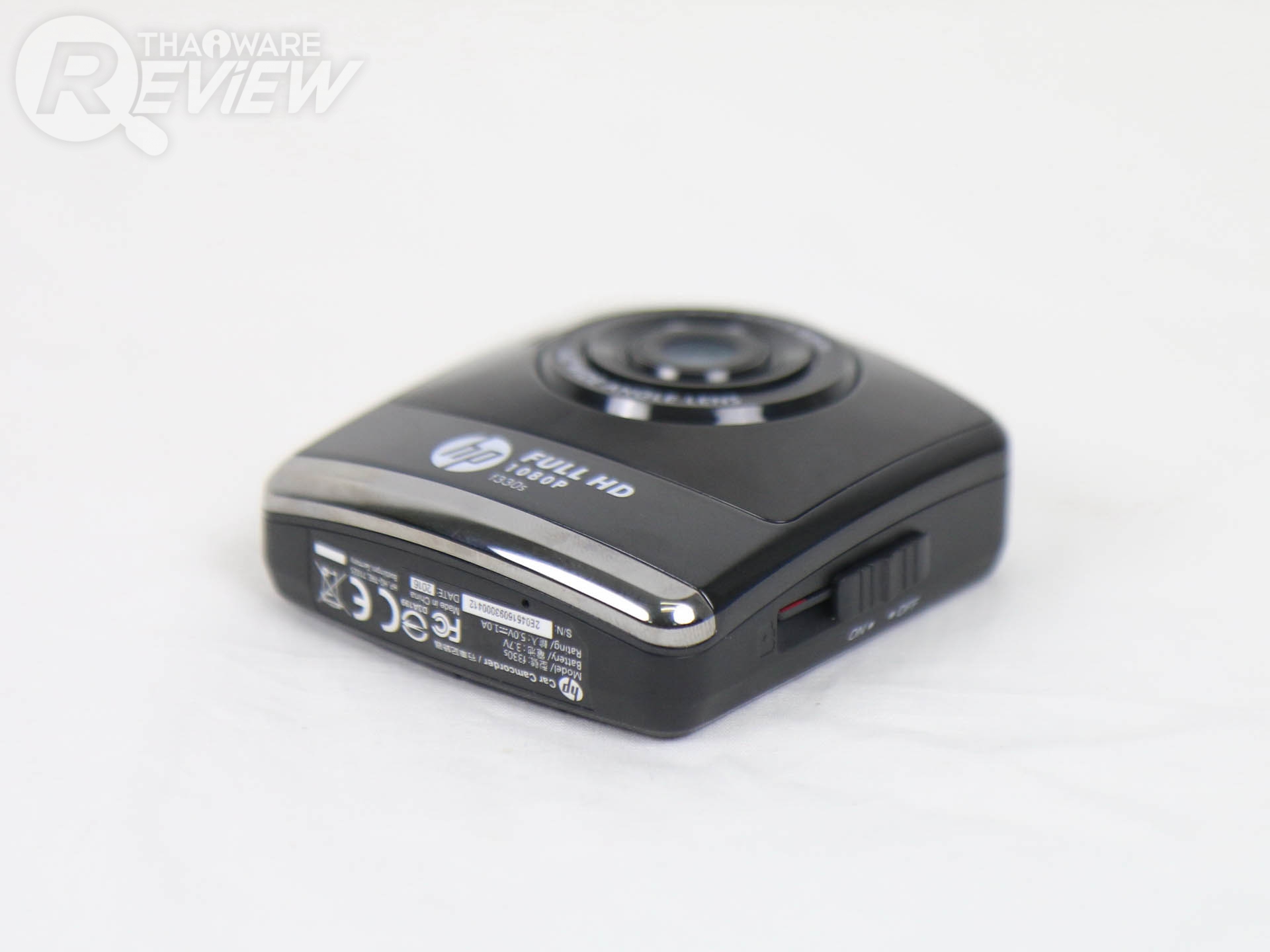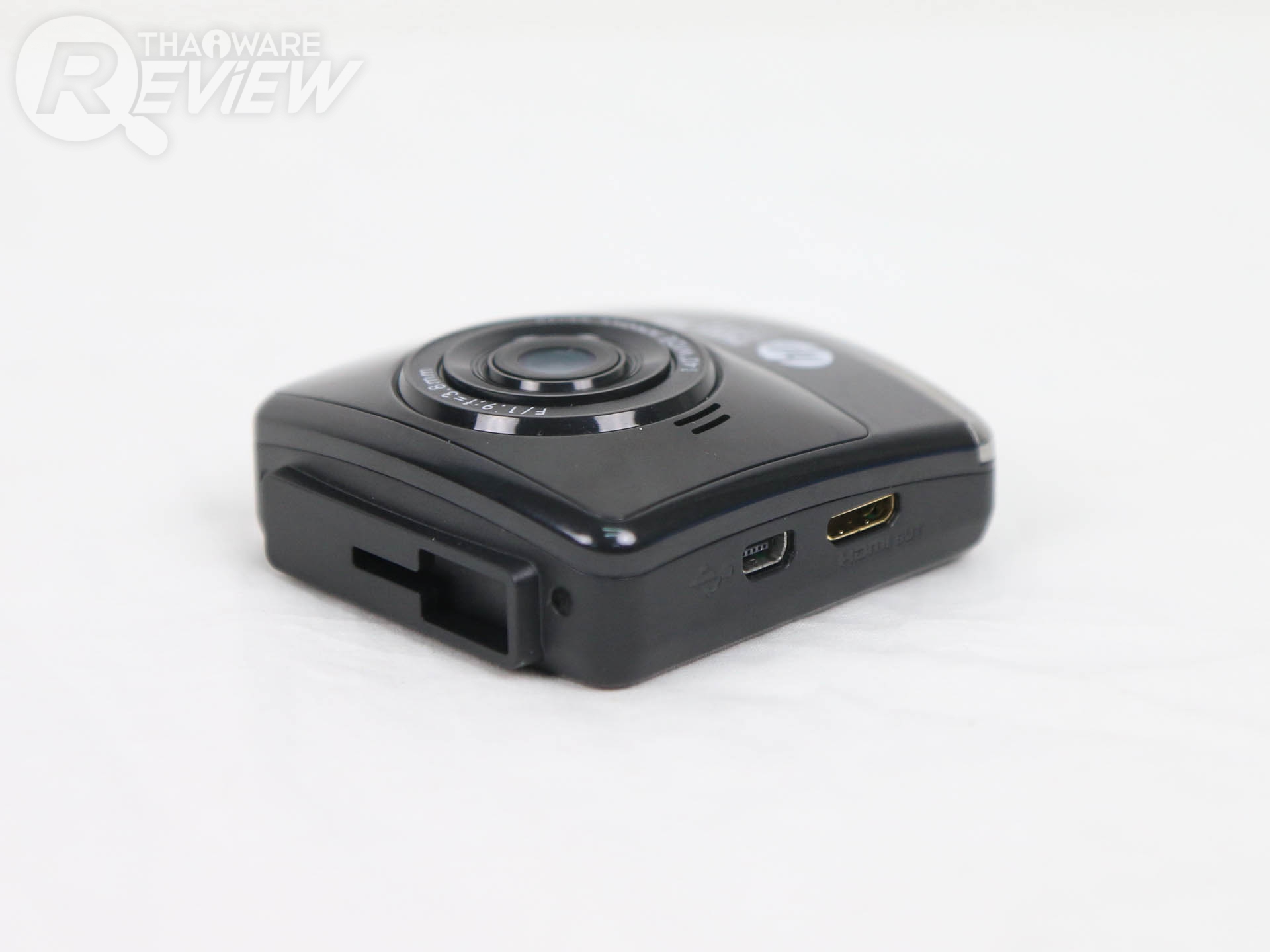 ด้านบนของกล้องจะมีร่องสำหรับเสียบเข้ากับที่ยึดกล้องในรถยนต์ ส่วนด้านข้างก็จะมีช่องสำหรับเสียบสายชาร์จ และช่อง HDMI