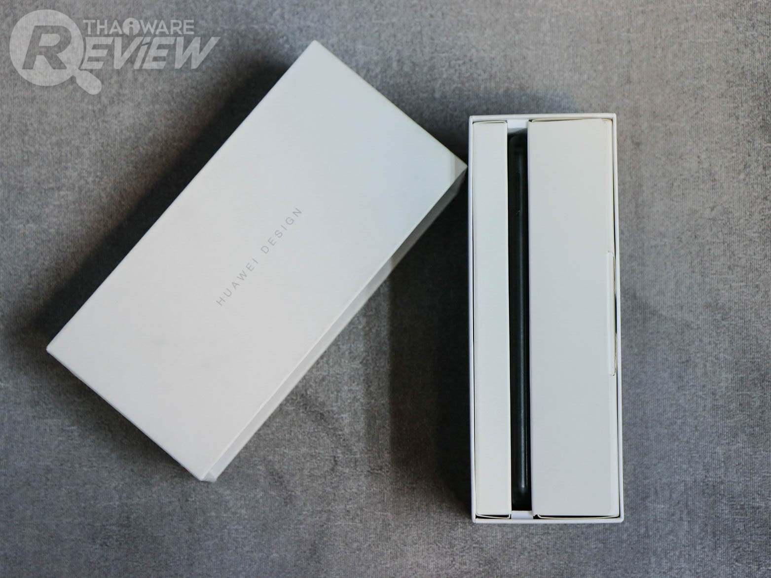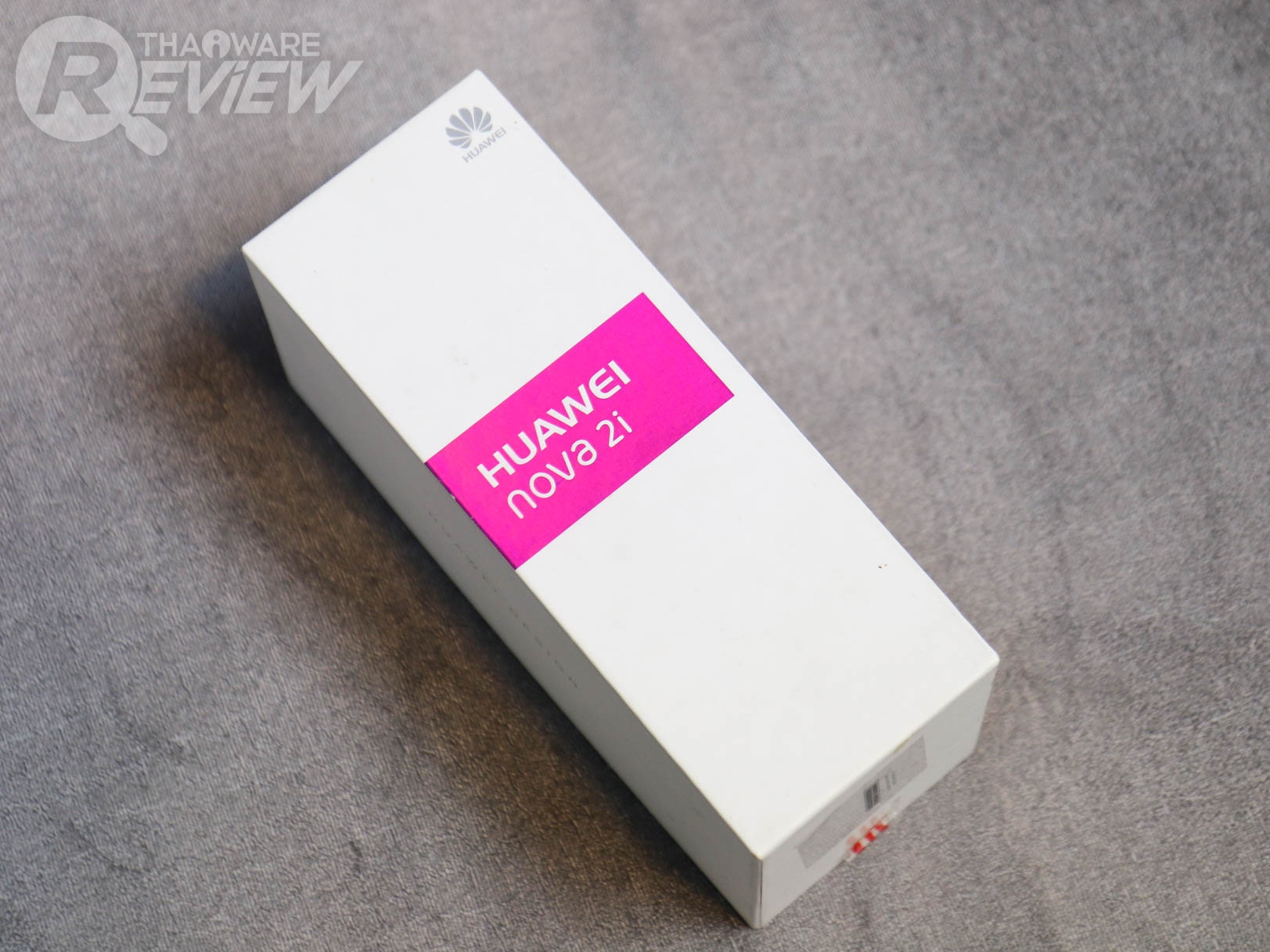 HUAWEI Nova 2i มาในกล่องแบบดึงออกด้านข้าง ตัวเครื่องจะถูกประกบอยู่ตรงกลางเหมือนกับแฮมเบอร์เกอร์ ข้างในกล่องที่แบนๆ จะมีเคสให้มา ส่วนอีกกล่องที่หนาๆ จะมีอะแดปเตอร์, หูฟัง แล้วก็สายชาร์จ