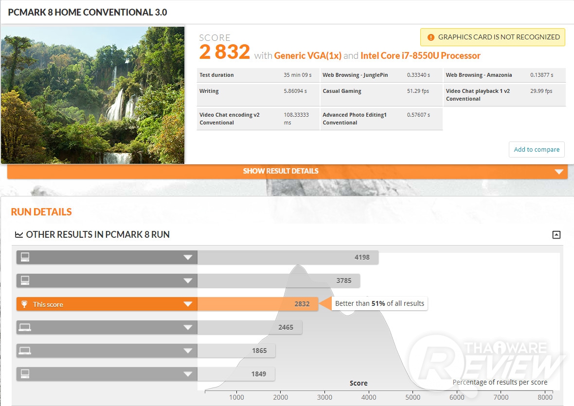 ในหัวข้อการทดสอบ PCMARK 8 HOME CONVENTIONAL 3.0 ที่เป็นการทดสอบประสิทธิภาพในเรื่องการใช้งานคอมพิวเตอร์ในระดับทั่วๆ ไป อาทิ การท่องเว็บ, การเขียนไฟล์เอกสาร, การตกแต่งแก้ไขภาพอย่างง่าย, การทำวิดีโอคอล และการเล่นเกมส์ที่กินสเปกเครื่องไม่สูงนัก ผลปรากฏว่าโน้ตบุ๊คเครื่องนี้ทำได้ 2,832 คะแนน ซึ่งเป็นคะแนนที่สูงทีเดียว