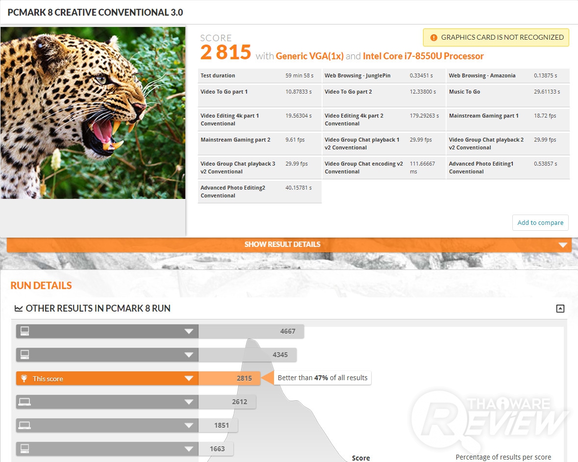 ในหัวข้อการทดสอบ PCMARK 8 CREATIVE CONVENTIONAL 3.0 ที่เป็นการทดสอบประสิทธิภาพในเรื่องการสร้างสรรค์คอนเทนต์วิดีโอ และภาพนิ่งระดับมืออาชีพ อาทิ การท่องเว็บ, การตกแต่งแก้ไขภาพระดับสูง, การตัดต่อวิดีโอ, การทำวิดีโอคอลแบบกลุ่ม, การเข้ารหัสไฟล์มัลติมีเดีย และการเล่นเกมส์ที่กินสเปกเครื่องในระดับกลาง ผลปรากฏว่าโน้ตบุ๊คเครื่องนี้ทำได้ 2,815 คะแนน
