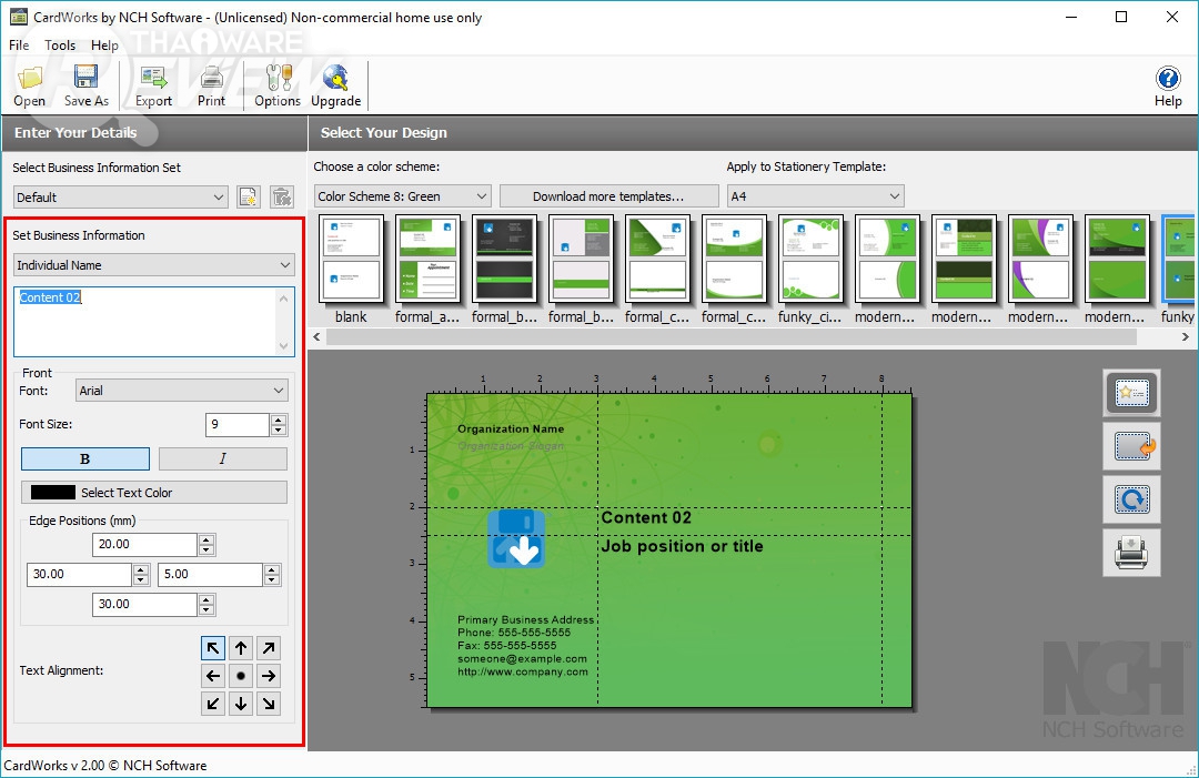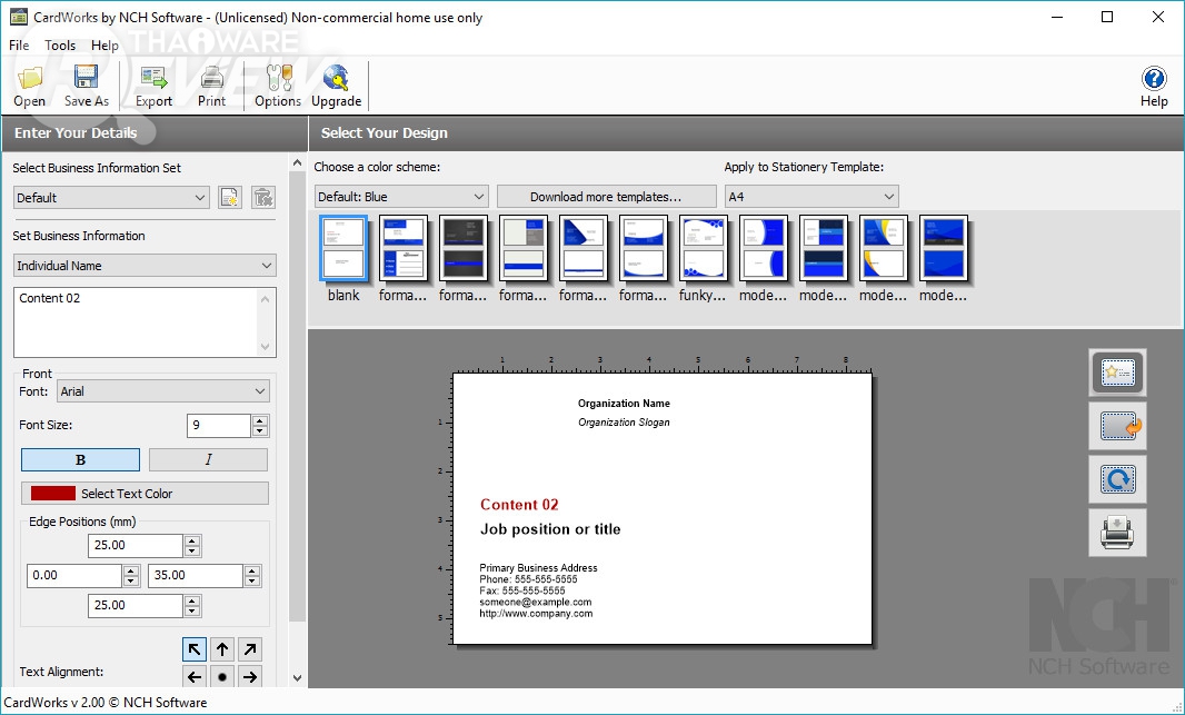 ตัวเทมเพลตนามบัตรสำเร็จรูปของโปรแกรมนี้ เริ่มต้นจะมีให้เลือกใช้ด้วยกัน 10 รูปแบบ ซึ่งดีไซน์ของนามบัตรจะมีการออกแบบที่เป็นกลาง สามารถใช้งานได้กับทุกธุรกิจ ไม่ได้มีดีไซน์สำหรับธุรกิจเฉพาะ (ซึ่งเราสามารถไปแก้ไข เพิ่มเติมรูป หรือโลโก้ในภายหลังได้) ซึ่งเราสามารถเปลี่ยนโทนสีของนามบัตรได้ถึง 10 สีด้วยกัน