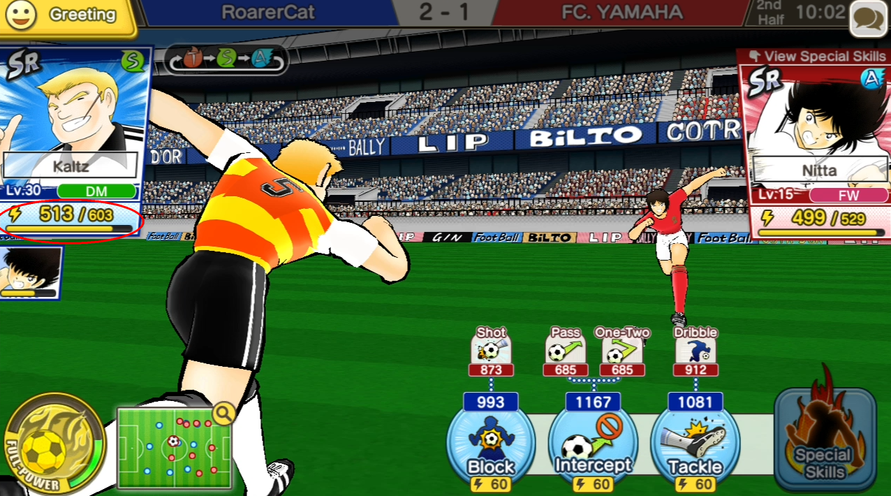 ค่าพลังงาน (Energy) ค่าปัจจัยที่คอยจำกัดการใช้ท่าแอคชั่นคำสั่งแบบปกติและพิเศษต่อแมทช์ (อาทิ ยิงประตูจะใช้พลังงาน 60 แต้ม, ท่ายิงประตูแบบพิเศษใช้พลังงาน 120 แต้ม เป็นต้น) ซึ่งแต่ละตัวละครจะใช้ท่าแอคชั่นได้มากน้อยเท่าไหร่ ก็ขึ้นอยู่กับเลเวลและแรงค์ (Rank) และหากค่าปัจจัยดังกล่าวเหลือน้อยหรือหมดลง ตัวละครของเราก็ยังจะสามารถใช้แอคชั่นคำสั่งแบบธรรมดาได้อยู่ หากแต่ประสิทธิภาพของท่านั้นๆ จะน้อยลงกว่าปกติ ในส่วนนี้ผู้เล่นจึงต้องกะเกณฑ์และหาจังหวะดีๆ ที่จะใช้ท่าทั้งหลายเพื่อให้การใช้ท่าแอคชั่นคำสั่งในแต่ละแมทช์หวังผลได้มากที่สุด