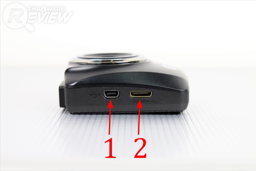 มาดูส่วนประกอบต่างๆ รอบๆ ตัวกล้องกันบ้าง ด้านขวาตัวกล้องเป็นตำแหน่งของพอร์ต mini-USB (1) สำหรับเสียบสายจากปลั๊กที่จุดบุหรี่ในรถยนต์เพื่อจ่ายพลังไฟให้ตัวกล้อง และช่องพอร์ต HDMI (2) สำหรับเชื่อมต่อเพื่อเปิดดูภาพและคลิปวิดีโอออกหน้าจอ LCD-TV