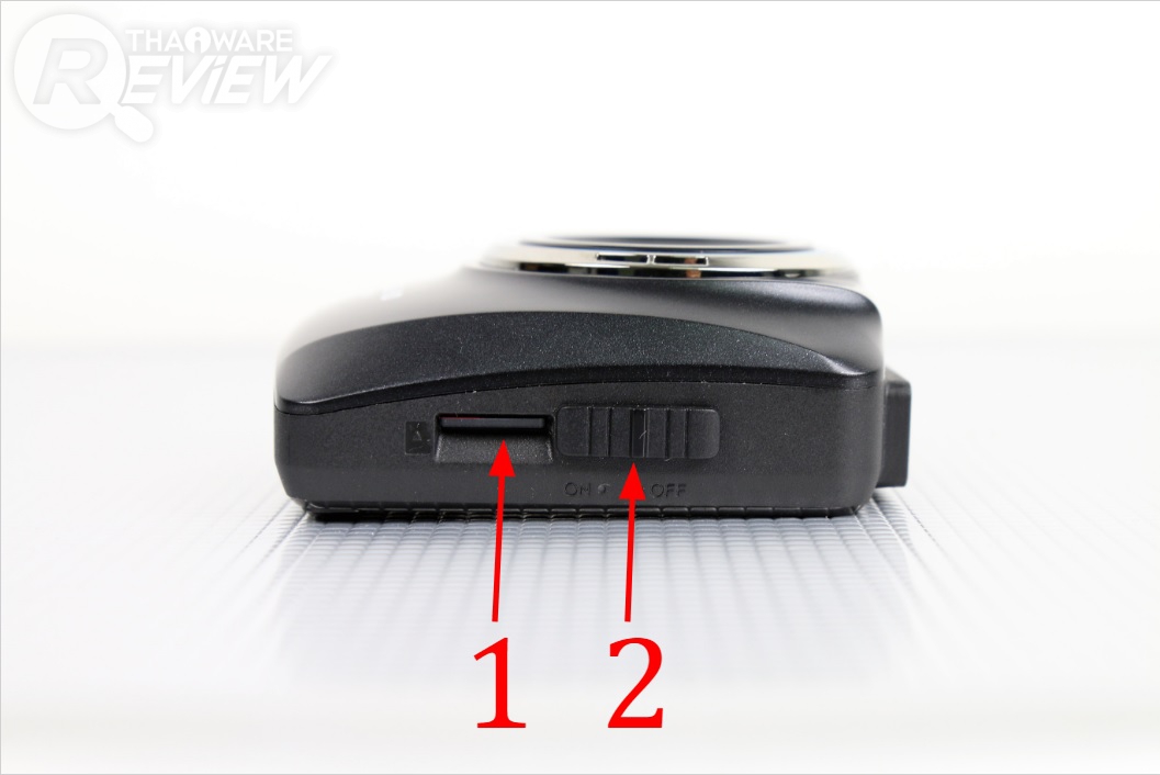 ด้านซ้ายตัวกล้องเป็นตำแหน่งของช่องเสียงการ์ด microSD (1) รองรับการ์ดความจุสูงสุด 32GB และสำหรับการใช้งานในรูปแบบกล้องดิจิตอล ก็สามารถสั่งเปิด/ปิดการทำงานของกล้องผ่านปุ่ม Power (2) แต่หากเป็นการใช้งานในรถยนต์แล้ว กล้อง hp f350 สามารถเปิดตัวเองขึ้นมาทำงานบันทึกคลิปโดยอัตโนมัติเมื่อสตาร์ทรถ และปิดตัวเองโดยอัตโนมัติเมื่อมีการดับเครื่องยนต์