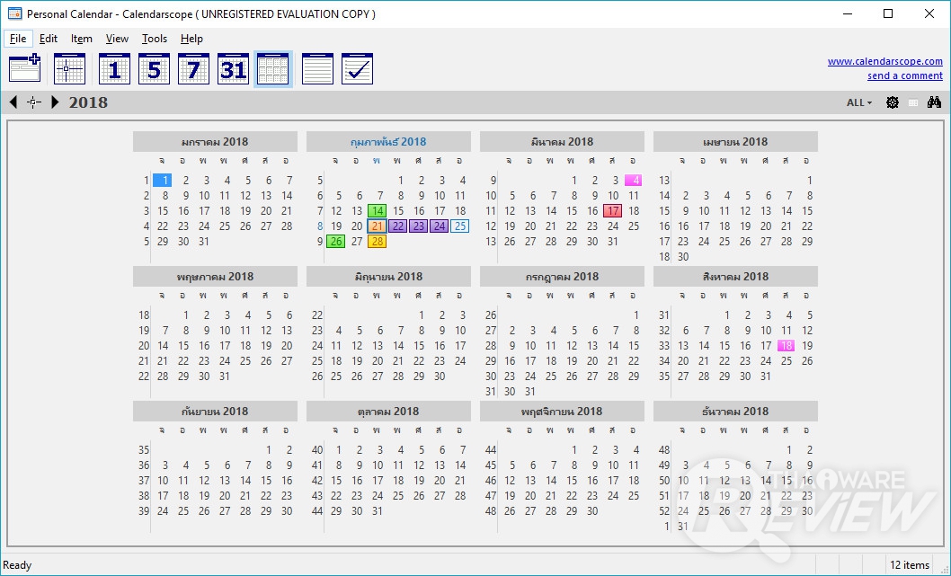โดยกำหนดการต่างๆ ที่เราตั้งเอาไว้ จะถูกแสดงผลเป็นกรอบสีต่างๆ แบ่งตามหมวดหมู่ประเภทกิจกรรมที่เรากำหนด ครอบทับวันที่เอาไว้ให้เราสังเกตได้ง่าย