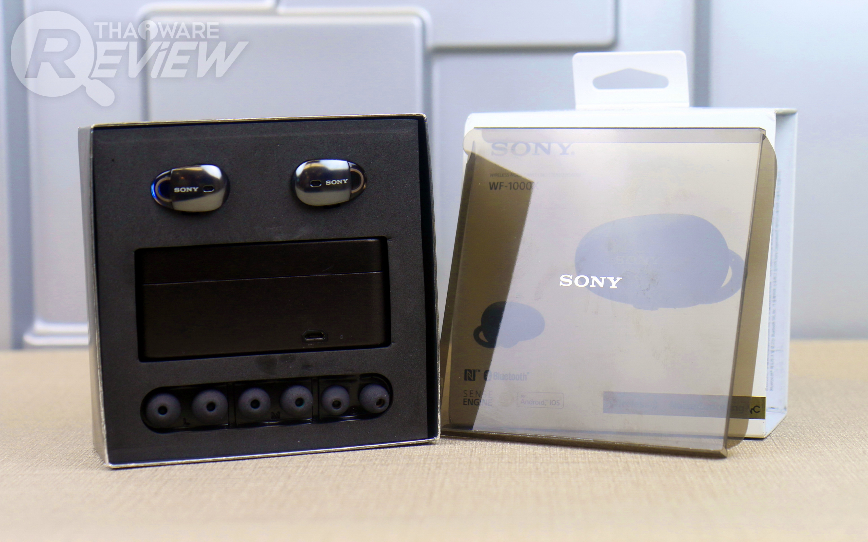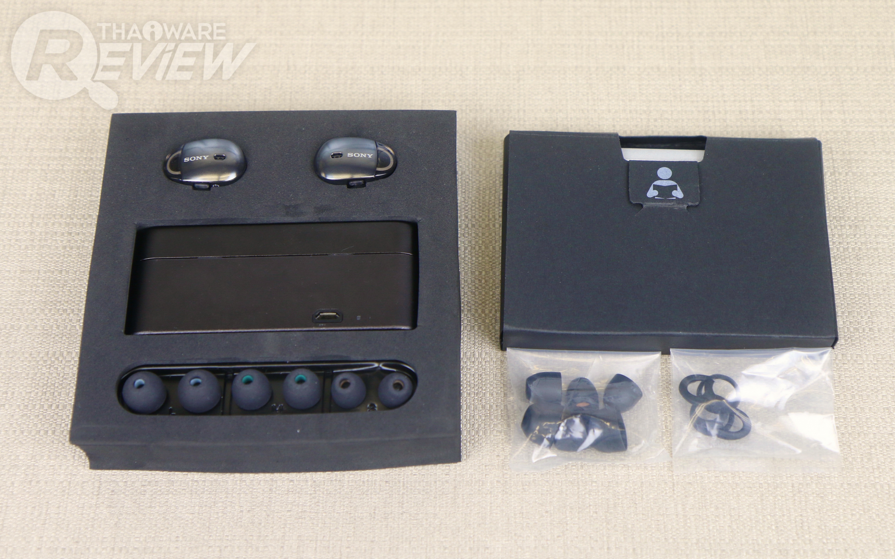 กล่องของหูฟังรุ่นนี้ มีดีไซน์ที่ทำให้ผมคิดถึงกล่องของหูฟัง Sony MDR - EX1000 ที่เคยเป็นรุ่นเรือธงในอดีต ตัวหูฟังใส่มาในช่องของฟองน้ำแข็ง ตรงกลางคือ เคสสำหรับพกพาและชาร์จแบตเตอรี่ ส่วนด้านล่างสุดจะเป็นจุกสำรอง ให้เราเลือกเปลี่ยนได้ตามขนาดรูหูของเรา เป็นจุกแบบยางทั้งหมดนะครับ ใครชอบจุกโฟมคงต้องหาซื้อมาเปลี่ยนเอง