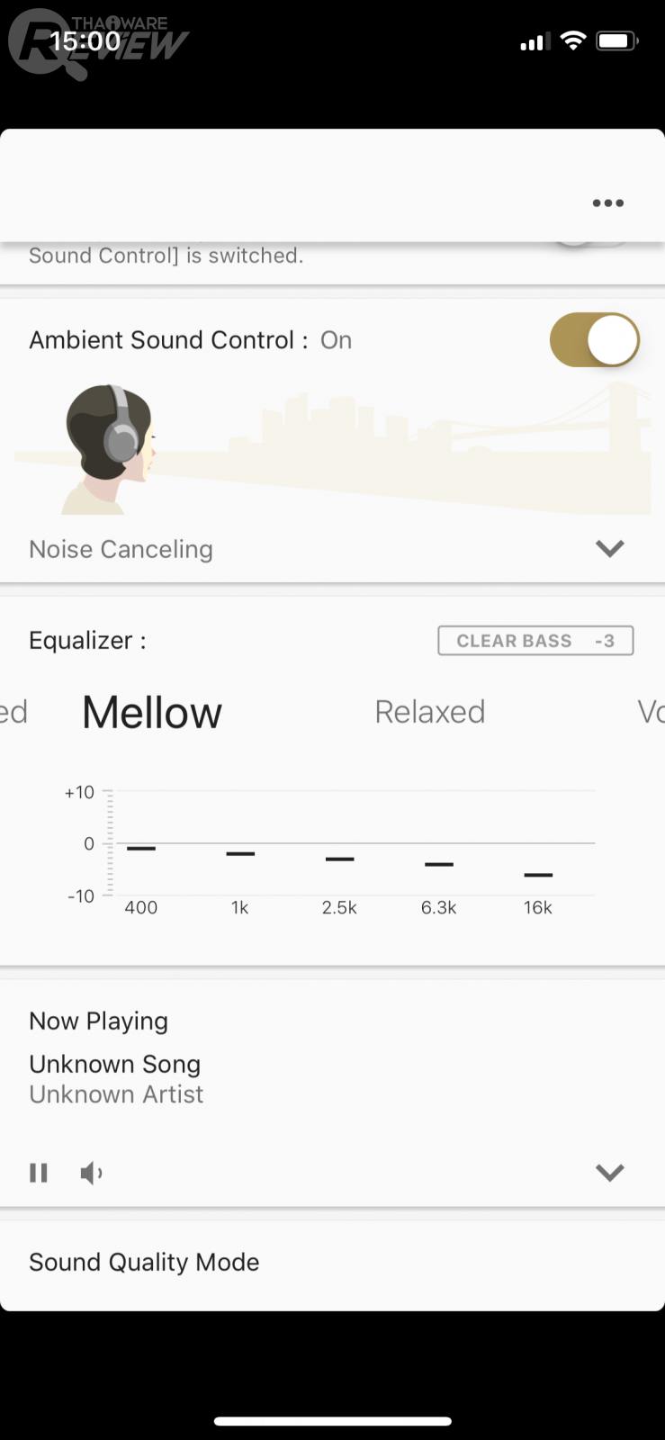 หูฟังรุ่นนี้มีโหมดการฟังให้เลือกหลายแบบนะครับ จะฟังแบบตัดเสียงรบกวน (Noise Canceling) และเปิดให้ได้ยินเสียงภายนอกด้วย (Ambient Sound) การเลือกจะกดเลือกโหมดจากตัวหู (ฝั่งซ้าย) หรือกดเลือกจากแอปฯ Headphones ก็ได้
