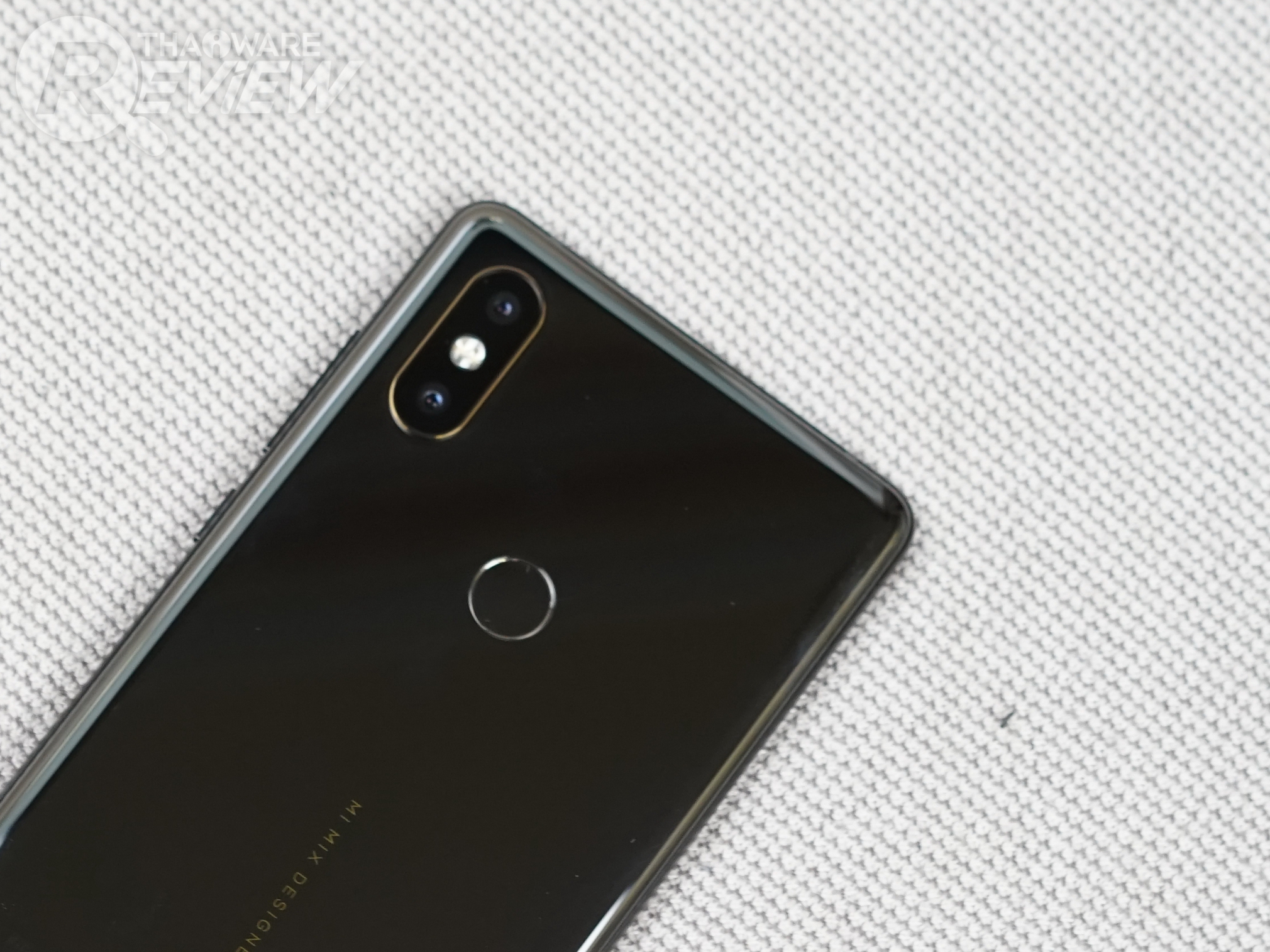 มาดูที่ด้านหลังกันบ้าง ฝาหลังเซรามิคให้ความรู้สึกหรูหราอย่างที่วัสดุอื่นให้ไม่ได้ (จริงๆ นะ) มีตัวอักษรสีทอง MI MIX DESIGNED BY XIAOMI กล้องหลังถูกวางมาในแนวตั้ง มีเซ็นเซอร์สแกนลายนิ้วมืออยู่ตรงกลาง จากการทดสอบของเราทำงานได้เร็วมากฮะ แค่แตะก็ปลดล็อกเครื่องเข้าหน้า Homescreen ได้ในทันที (ไม่จำเป็นต้องเปิดจอก่อน)