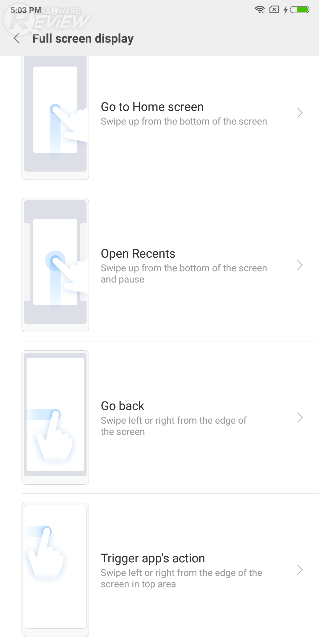 ผู้ใช้แอนดรอยด์คงจะชินกับการใช้ 3 ปุ่มมาตรฐานกันดี (ปุ่มโฮม, ปุ่มถอย และปุ่มมัลติทาร์ก) แต่ใน MIUI 9 ได้มีระบบแสดงผลแบบเต็มๆ ที่ไม่ต้องใช้เจ้า 3 ปุ่มนี้ด้วย เรียกว่าโหมด Full screen gesture