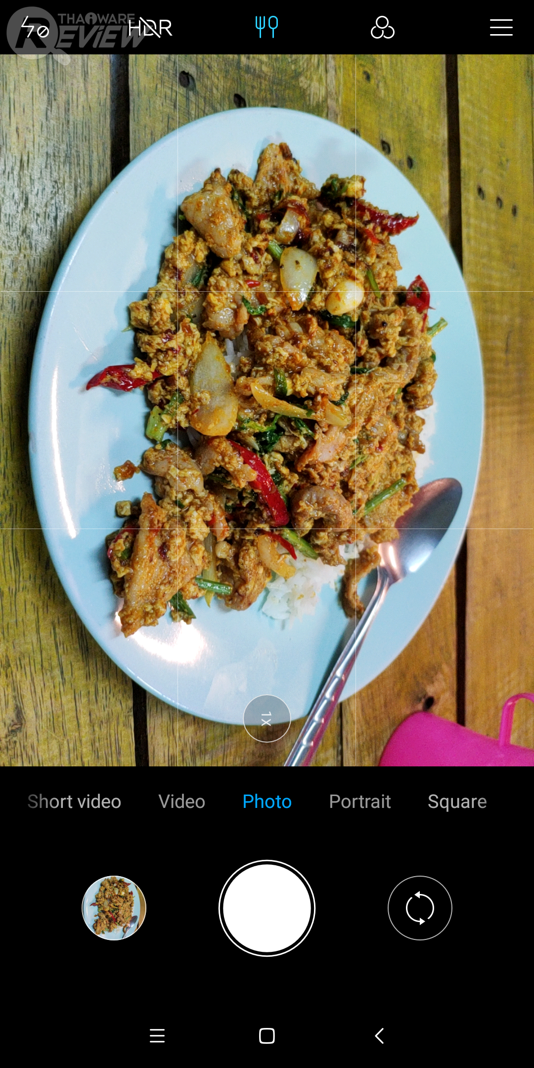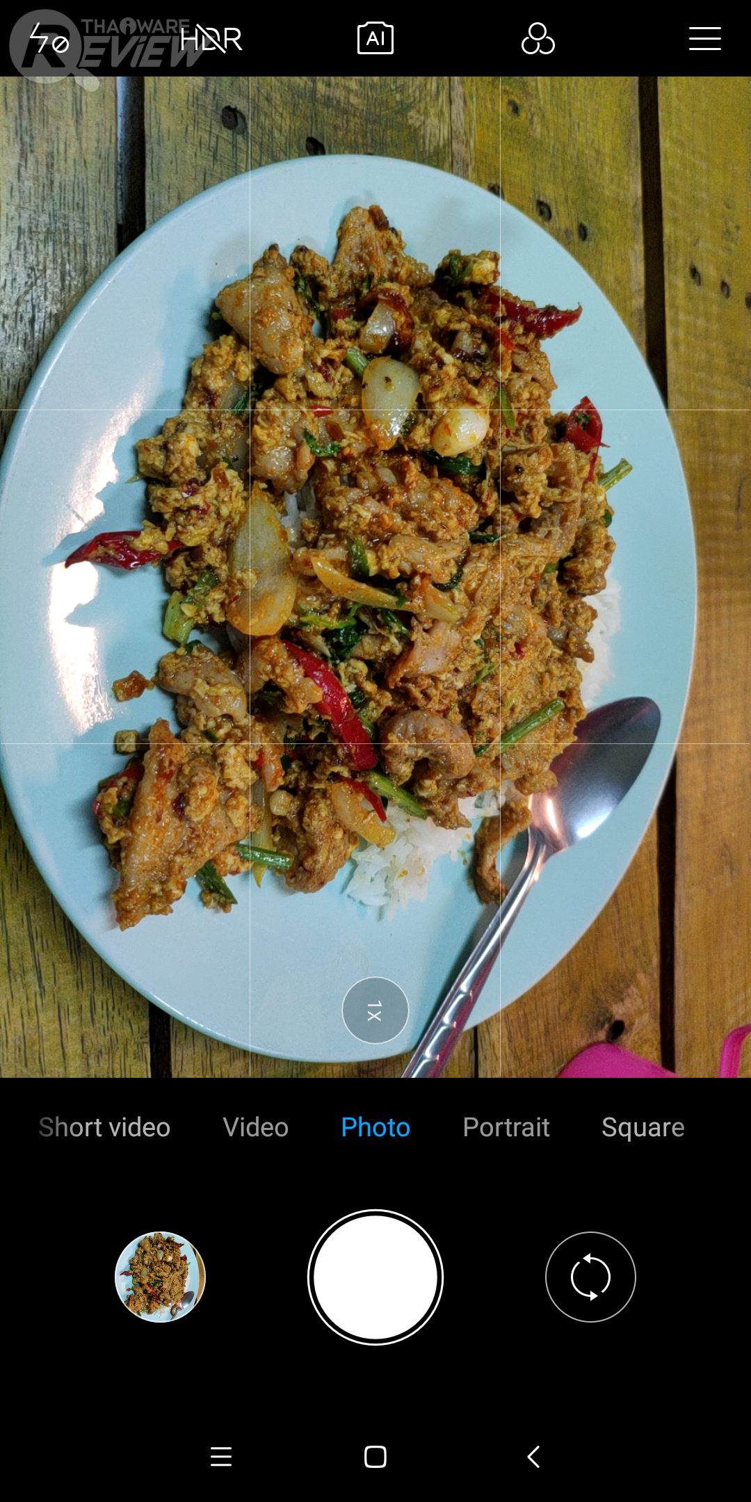 อย่างในภาพด้านล่างนี้ ภาพแรกจะเห็นว่าสีอาหารดูไม่ค่อยสด ไม่น่ากินเท่าไหร่ ส่วนภาพที่สองเราถ่ายด้วยโหมด AI (สังเกตว่า AI ได้ตรวจพบว่าเรากำลังถ่ายภาพอาหาร ไอคอนได้เปลี่ยนเป็นรูปช้อนส้อม) ภาพจะมีการปรับโทนสีให้ดูน่ากินมากกว่าเดิม