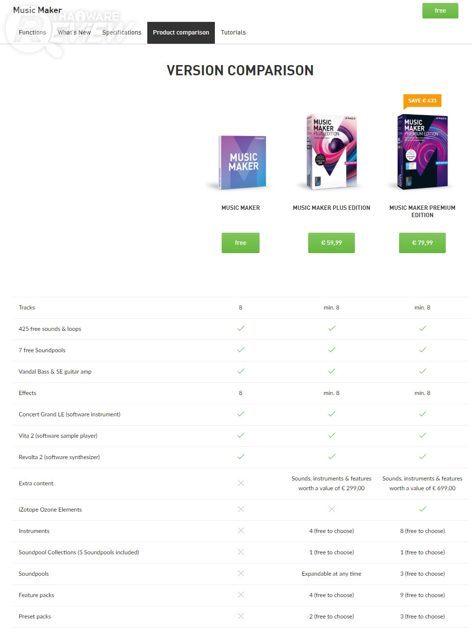 โปรแกรม Music Maker จะมีด้วยกัน 3 เวอร์ชันหลักๆ ได้แก่ Music Maker (ใช้งานฟรี), Plus Edition และ Pro Edition ที่ความแตกต่างก็คือ ในเวอร์ชันฟรี จะสามารถจัดการแทร็คต่างๆ ได้เพียง 8 แทร็คเท่านั้น ส่วนในเวอร์ชัน Plus และ Pro นอกจากจะมีแทร็คให้ใช้งานมากกว่า 8 แทร็คแล้ว ยังมีเสียงประกอบ รวมทั้งเครืองมือต่างๆ ให้ใช้งานมากกว่าเวอร์ชันฟรีอีกด้วย