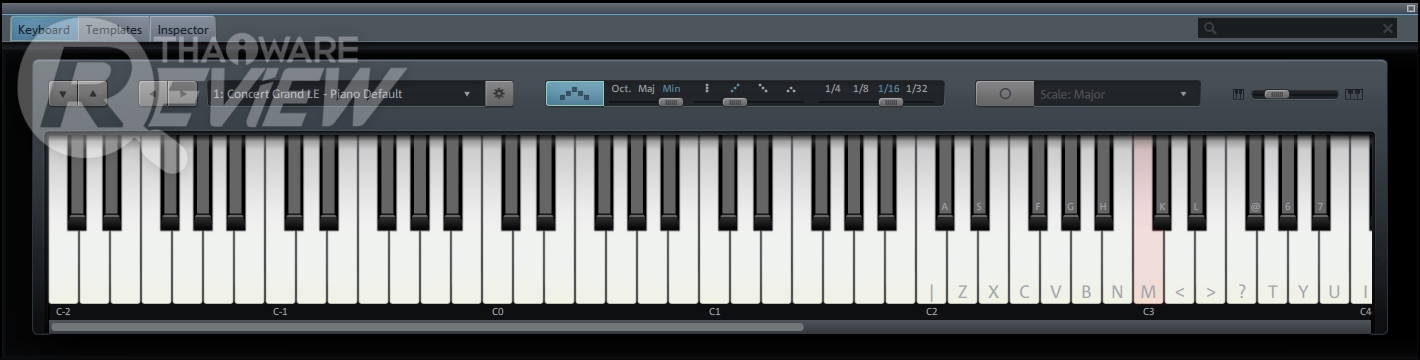 ลักษณะของตัว MIDI Keyboard ในโปรแกรม จะมีหน้าตาเหมือนกับเปียโนคีย์บอร์ด ที่เราสามารถ ใช้เครื่องมือ Instruments ต่างๆ ใส่ลงไปเพื่อเปลี่ยนเสียงให้คีย์บอร์ดตัวนี้แทนเครื่องดนตรีประเภทต่างๆ โดยเราสามารถใช้เมาส์คลิกที่โน้ตต่างๆ เพื่อเล่นเสียง หรือจะใช้คีย์ต่างๆ บนคีย์บอร์ดเพื่อเล่นก็ได้ (ดังที่เห็นในภาพ)