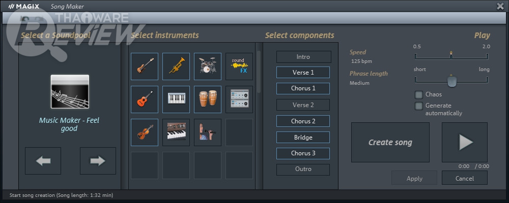 สุดท้ายเป็นเมนู Song Maker (คีย์ลัด W) สำหรับใครที่ไม่รู้ว่าจะเริ่มต้นอะไรก่อนหลังดี ซึ่งเมนูนี้ จะช่วยสร้างเพลงของเราจาก Soundpool ที่มีให้ โดยเราสามารถเลือกเครื่องดนตรีที่ต้องการ ท่อนที่อยากได้ รวมทั้งความเร็วของเพลง แล้วกดสร้างเป็นเพลงได้เลย หลังจากนั้น จะเพิ่ม/ลดอะไร ค่อยไปจัดการต่อในหน้า Track controls