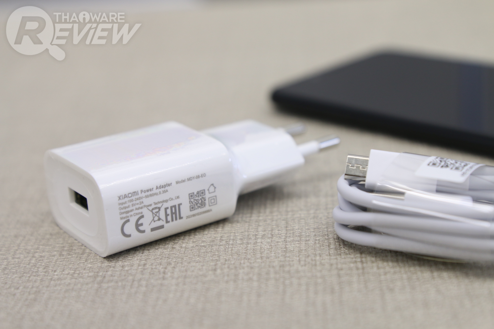 ส่วนอะแดปเตอร์รองรับการจ่ายไฟ 2A พร้อมสาย microUSB ซึ่งอาจจะชาร์จไฟได้ไม่เร็วเท่าสมาร์ทโฟนรุ่นอื่นๆ ในท้องตลาด (Redmi Note 5 รองรับ Quick Charge 2.0) และหัวปลั๊กเป็นแบบหัวปลั๊กกลม 2 ขา ซึ่งโดนส่วนตัวแล้ว เราไม่ชอบหัวปลั๊กแบบนี้เท่าไหร่นัก เพราะเป็นปลั๊กที่เสียบใช้งานกับเต้าเสียบส่วนใหญ่แล้วไม่ค่อยแน่น หลุดง่าย
