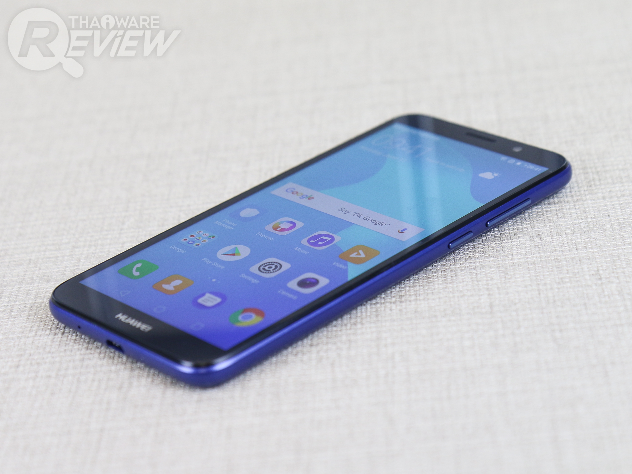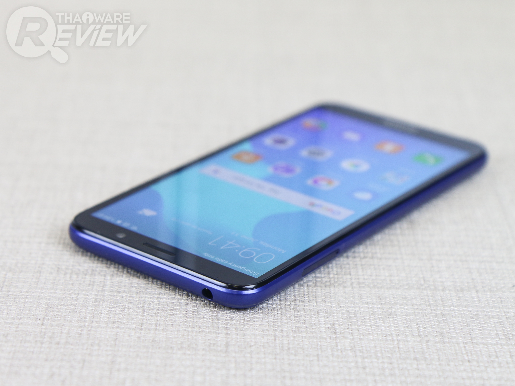 เครื่องที่เราได้มารีวิวเป็นสีน้ำเงิน วัสดุตัวเครื่องเป็นอลูมิเนี่ยมให้ผิวสัมผัสที่ดีไม่ก๊องแก๊ง ด้านหน้าเป็นกระจก มีหน้าจอใหญ่โตถึง 5.45 นิ้ว สัดส่วน 18:9 แต่จอไม่ค่อยละเอียดนะครับ จอมีความละเอียดอยู่ที่เพียง 1440 x 720 พิกเซล (295 ppi) แต่จริงๆ ถ้าไม่ตั้งใจเพ่งก็ไม่เห็นความหยาบของหน้าจอนะครับ ด้านบนมีกล้องหน้าความละเอียด 5MP และเซ็นเซอร์ Proximity อยู่ด้านข้างของลำโพง ลำโพงนี้คือลำโพงสนทนา และลำโพงของเครื่องเลยนะครับ คือฟังเพลง ดูวิดีโอ ก็เสียงออกที่ลำโพงนี้นี่แหละ