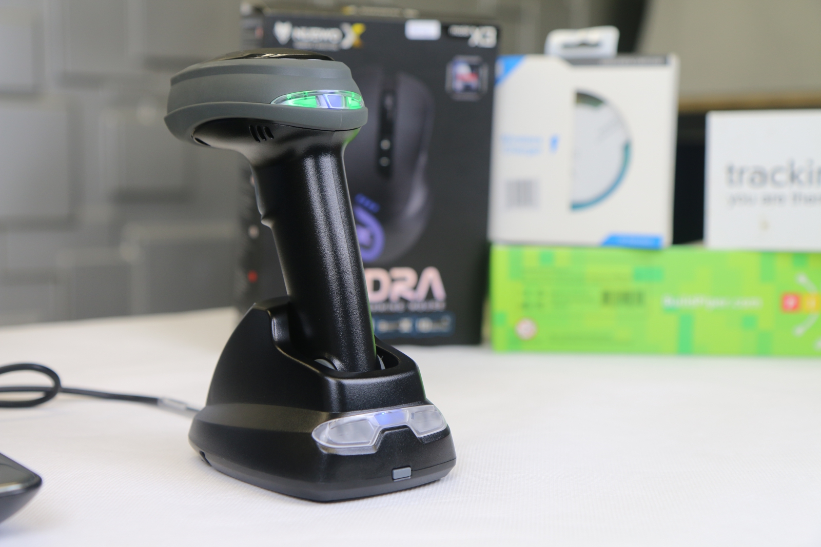 สำหรับธุรกิจที่จำเป็นต้องสต๊อกสินค้า อาจใช้นับยอดจำนวนคงเหลือในคลังได้ เนื่องจากมันไม่มีสาย และใช้งานได้ไกลถึง 100 เมตร (พื้นที่โล่ง) ผู้เขียนได้ทดลองวางแท่นรับที่เชื่อมต่อกับคอมฯ ไว้อีกห้องหนึ่ง แล้วเดินไปสแกนสินค้าบนชั้นวางที่อยู่ห้องถัดไป ปรากฏว่าสามารถใช้งานได้ปกติเลย โดยการสแกน 1 ครั้ง เท่ากับการนับสินค้า 1 ชิ้น อาจจะลำบากไปสักหน่อยสำหรับสินค้าที่มีจำนวนเยอะๆ หากใช้ร่วมกับโปรแกรมควบคุมคอมพิวเตอร์ระยะไกลผ่านสมาร์ทโฟน จะช่วยเพิ่มความคล่องตัวในการทำงานได้เลย ไม่ว่าจะอยู่ตรงไหนของสต๊อกสินค้าก็สามารถเช็คสินค้าได้อย่างสะดวกสบาย