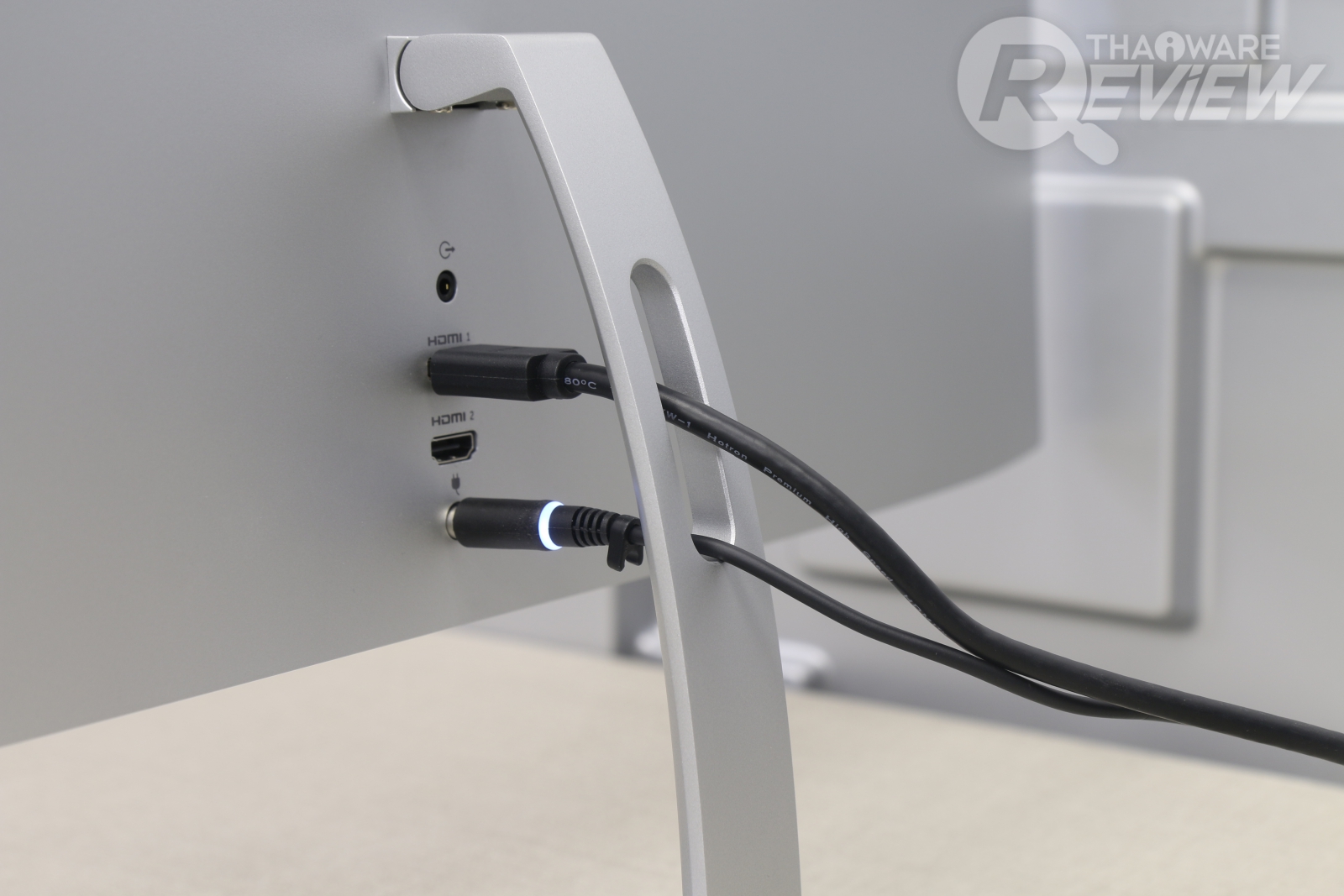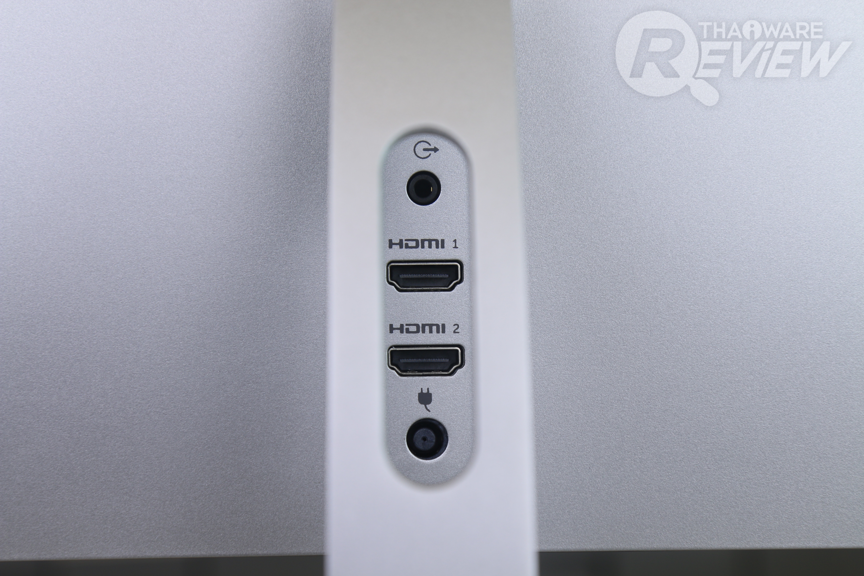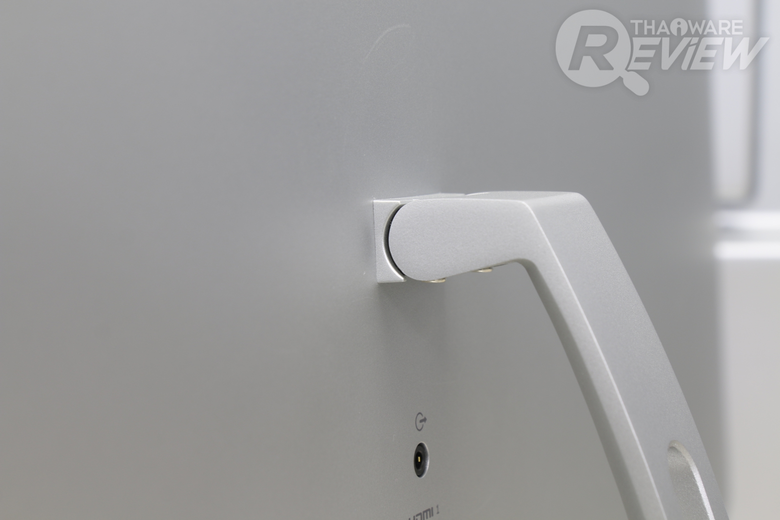 วัสดุขาตั้งจอแข็งแรงเป็นโลหะทั้งชิ้น ขนาดไม่ใหญ่มาก แต่ดูมั่นคง รองรับน้ำหนักของจอได้สบายๆ ส่วนพอร์ตเชื่อมต่อก็มี HDMI 2 ช่อง, ช่องเสียบลำโพง 3.5 มม. และช่องเสียบไฟเลี้ยง ตรงกลางมีช่องสำหรับสอดสายเพื่อเสียบจอ ข้อดีของมันก็คือเวลาเราเสียบสาย มันจะดูไม่รก และสามารถซ่อนสายไว้หลังขาตั้งได้อีกด้วย