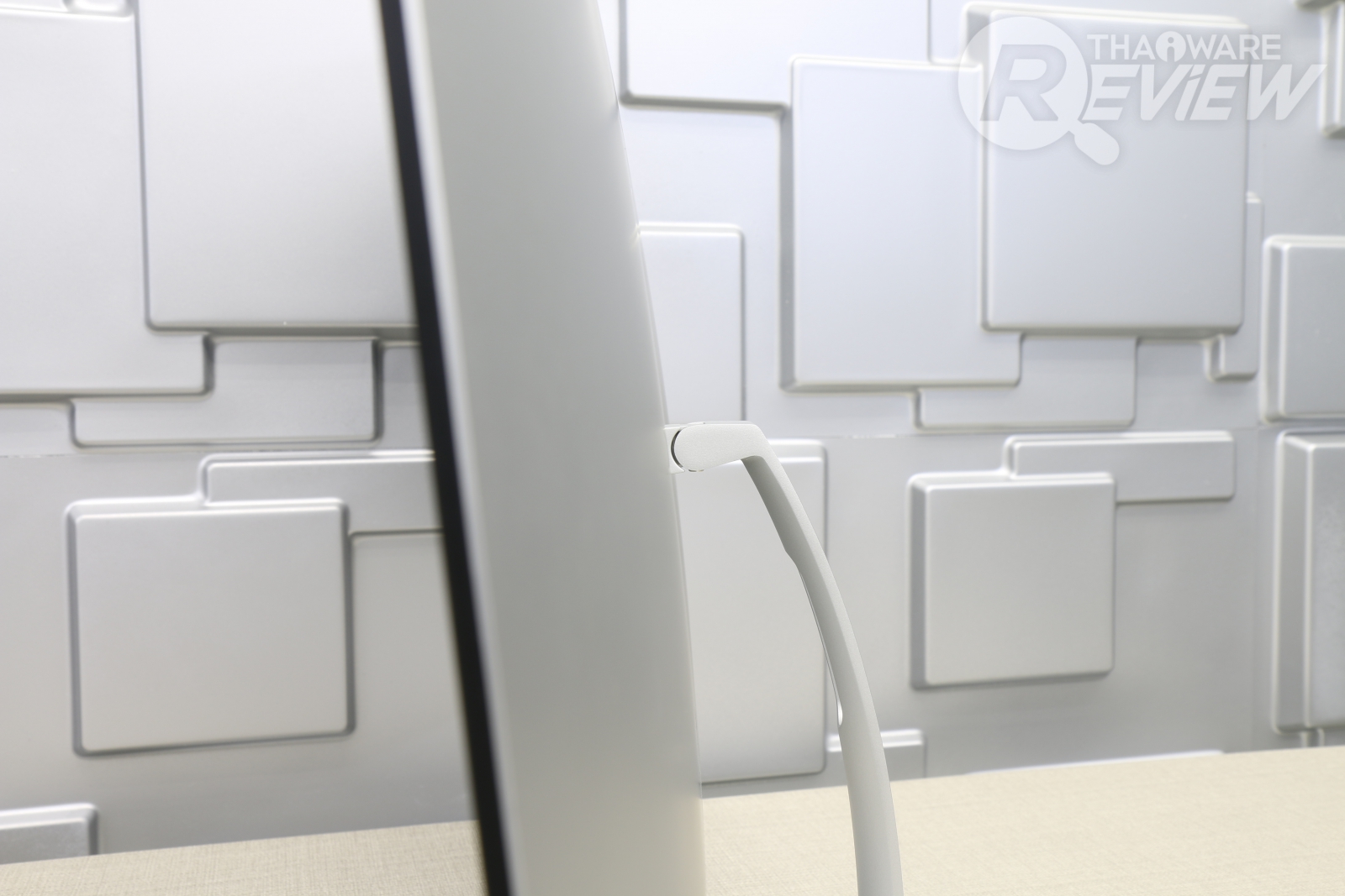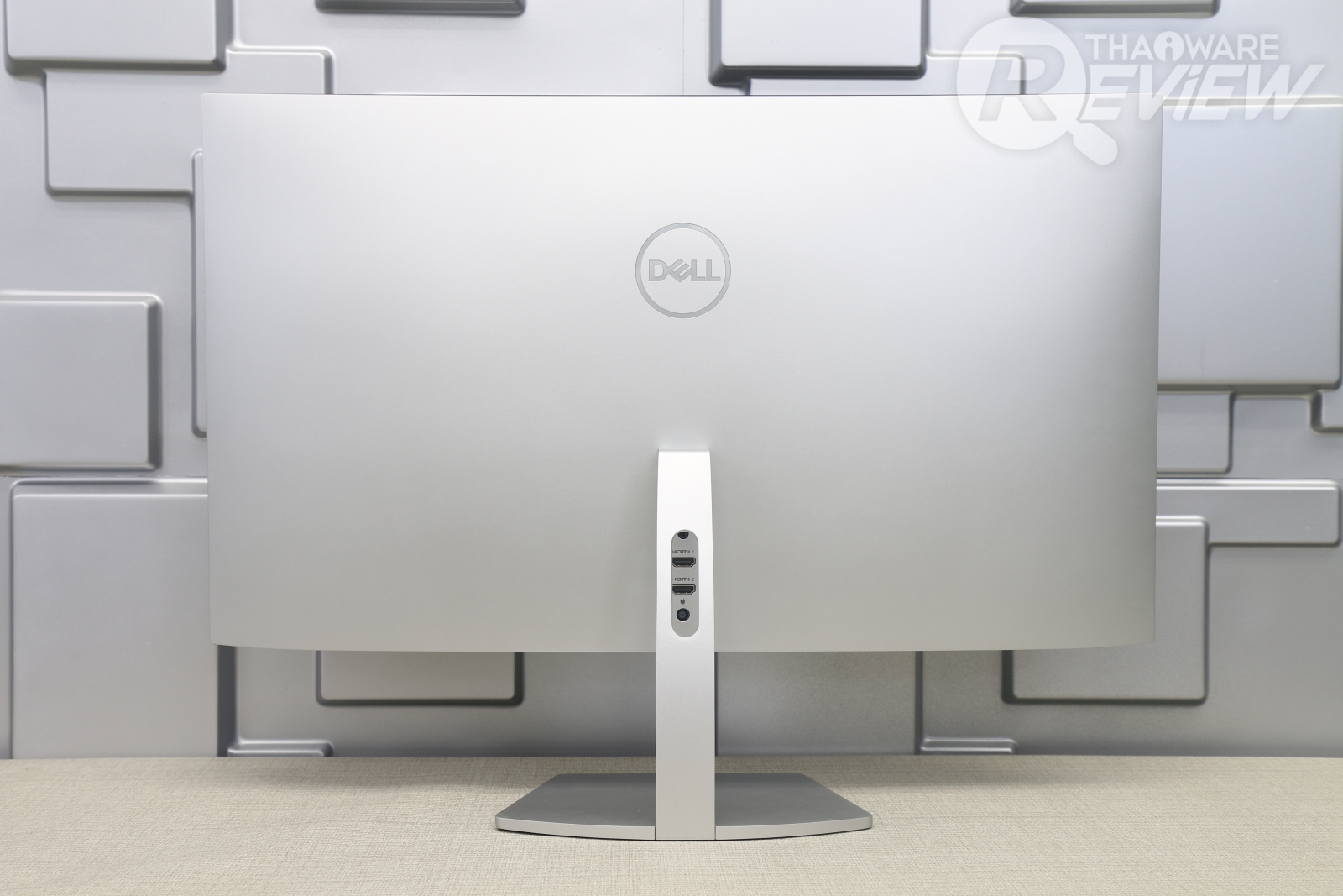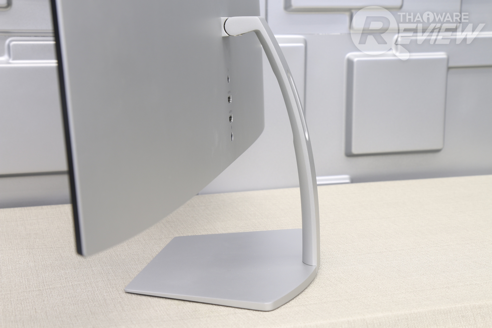 วัสดุขาตั้งจอแข็งแรงเป็นโลหะทั้งชิ้น ขนาดไม่ใหญ่มาก แต่ดูมั่นคง รองรับน้ำหนักของจอได้สบายๆ ส่วนพอร์ตเชื่อมต่อก็มี HDMI 2 ช่อง, ช่องเสียบลำโพง 3.5 มม. และช่องเสียบไฟเลี้ยง ตรงกลางมีช่องสำหรับสอดสายเพื่อเสียบจอ ข้อดีของมันก็คือเวลาเราเสียบสาย มันจะดูไม่รก และสามารถซ่อนสายไว้หลังขาตั้งได้อีกด้วย