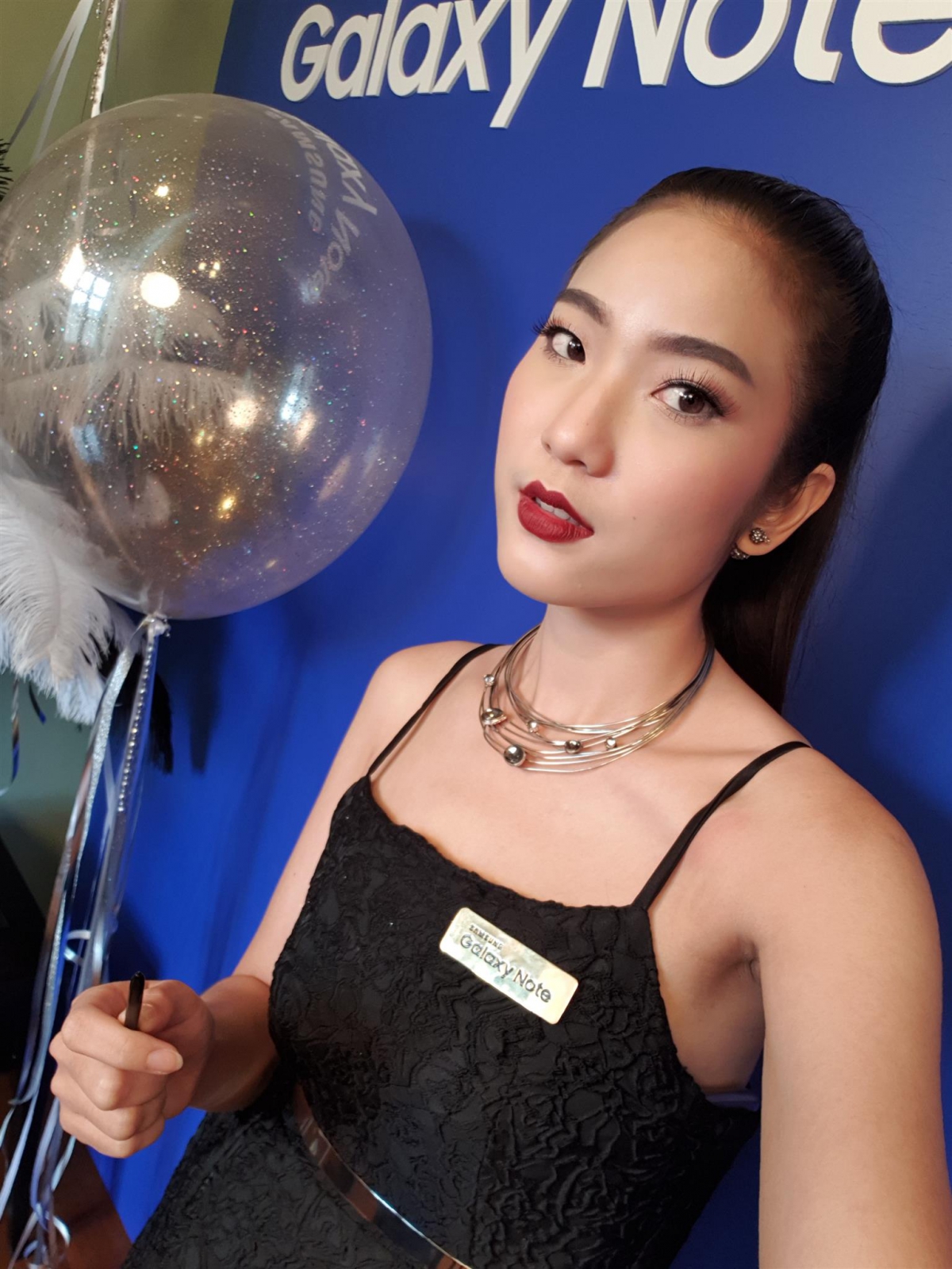 สังเกตที่มือขวาของสาวสวยคนนี้ ใช้ S Pen เป็นตัวกดชัตเตอร์ ทำให้ได้มุมในการถ่ายเซลฟี่ที่กว้างมากขึ้น ไม่ต้องพะวงกับการกดชัตเตอร์ที่ตัวมือถือ