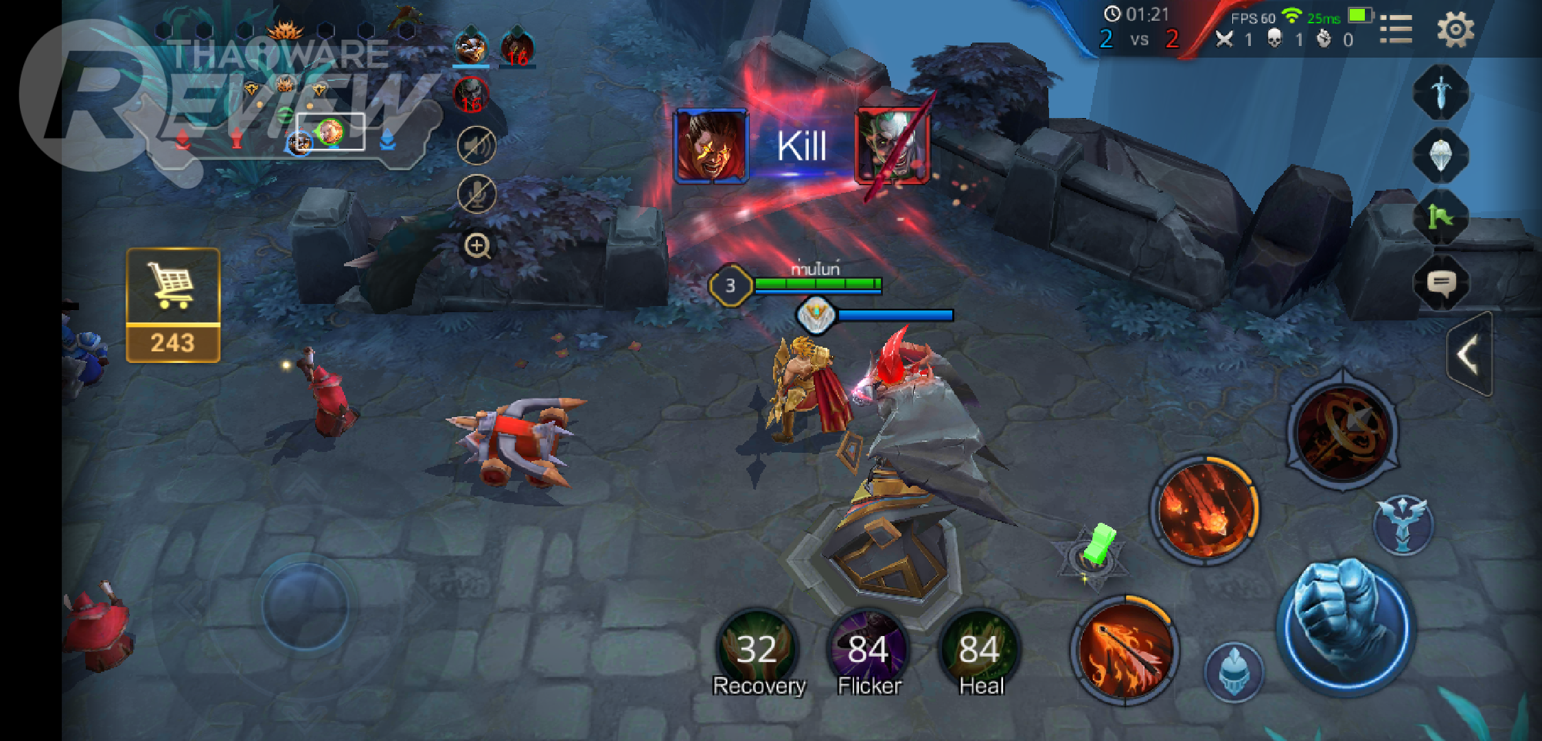 เล่นเกมส์ยอดนิยมอย่าง RoV ทำ 60fps ได้สบายๆ โหลดเกมส์เร็ว ปรับภาพความละเอียดสูงก็ยังทำเฟรมเรทได้ดี 60fps เกือบตลอดเวลาครับ มีตกไป 57-58 fps บ้างในบางจังหวะ